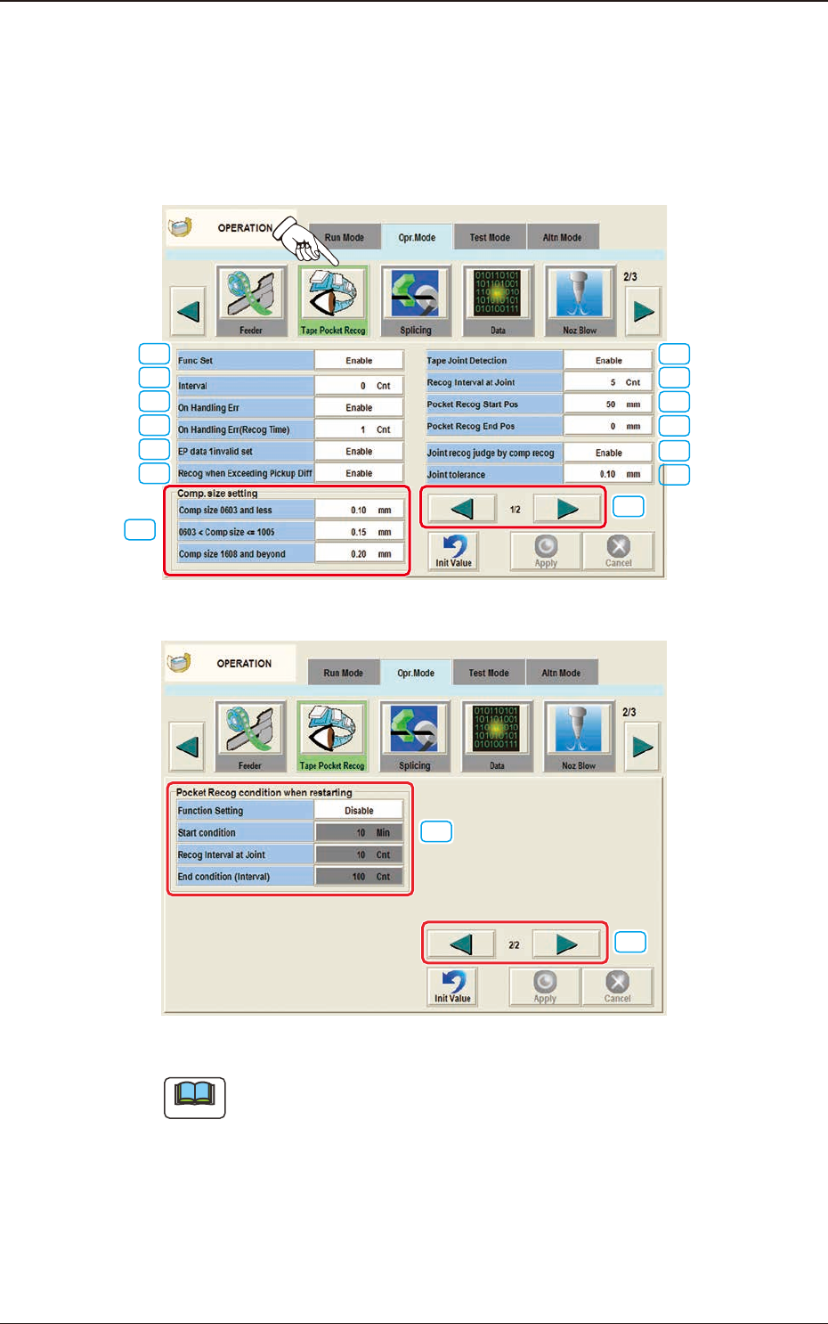 2OM-1751 1-48 1303-001 4.2.7 T ape Pocket Recog When the [Pocket Recognition] button is pressed on the "Operation Mode" tab sheet, the following tab sheet appears. This function recognizes the pocket edge secti…