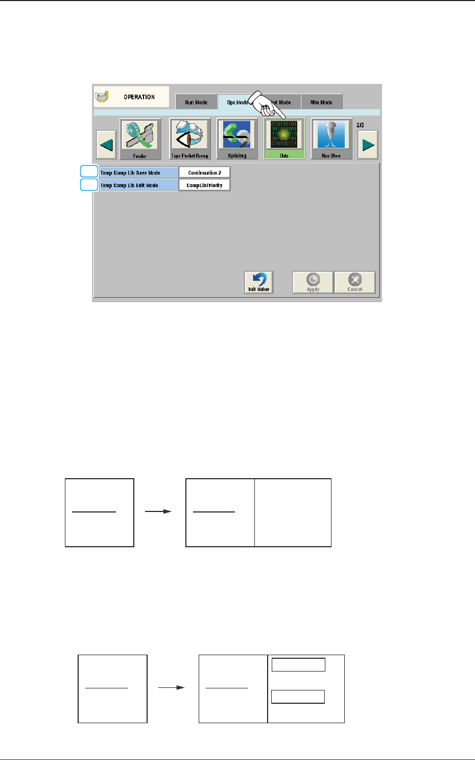 2OM-1751 1-55 1303-001 4.2.9 Data When the [Data] button is pressed on the "Opr. Mode" tab sheet, the following window appears. [2] [1] F2A36 [1] T emp Comp Lib Save Mode One of the following options can be sel…