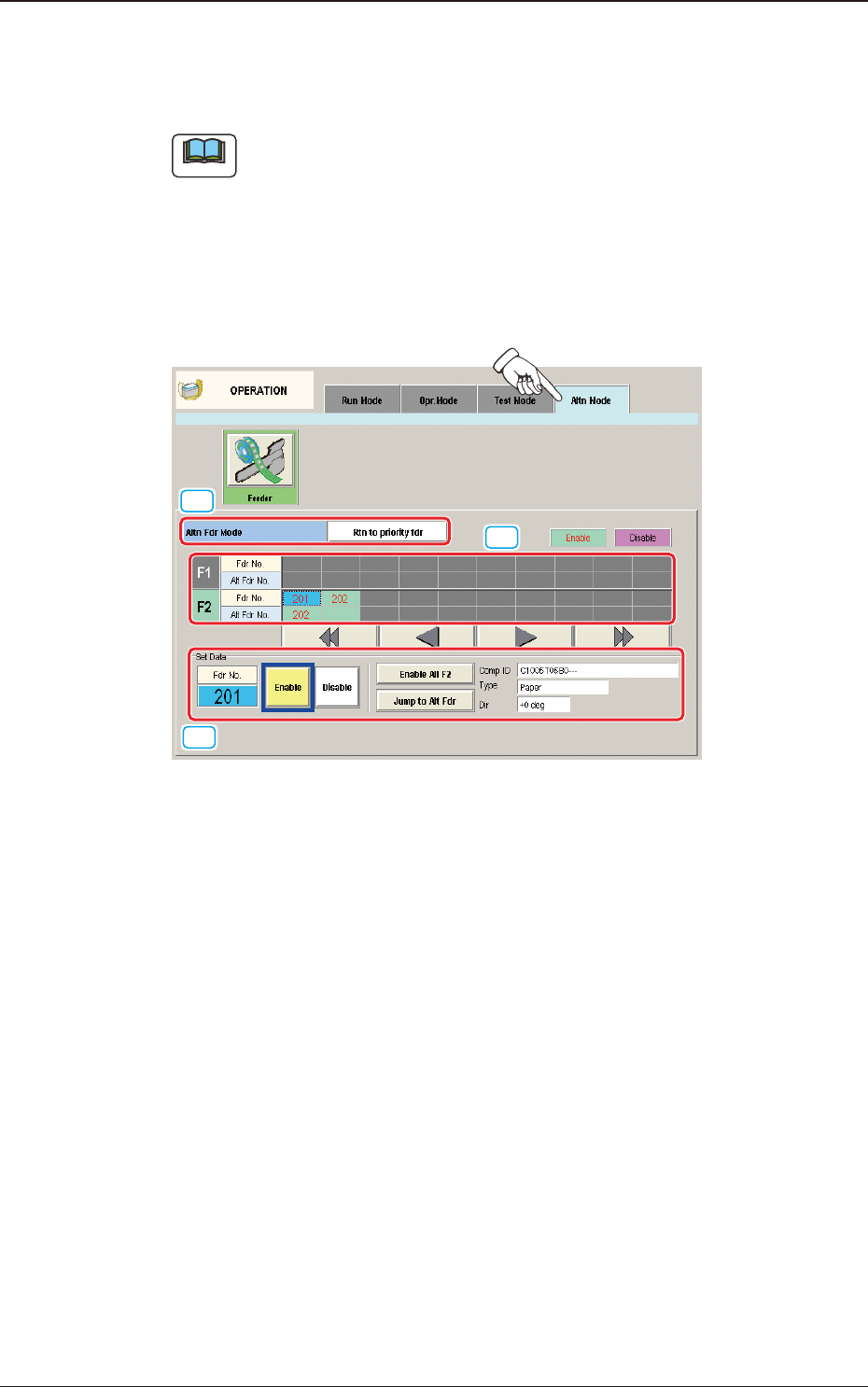 2OM-1751 1-64 1303-001 4.4 "Altn Mode" T ab Sheet [Keep current fdr] Button When selected, the "Feeder Alternate" function is enabled. After the components on the specied feeder No., are used up, whe…