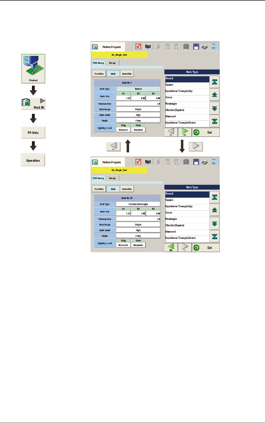 2OM-1751 2-27 1303-001 (C02_01) Mark No. The mark Nos. correspond to the mark codes and the specied parameters of each ducial mark used in the PEC recognition function. 10 types of mark codes can be registered for each…