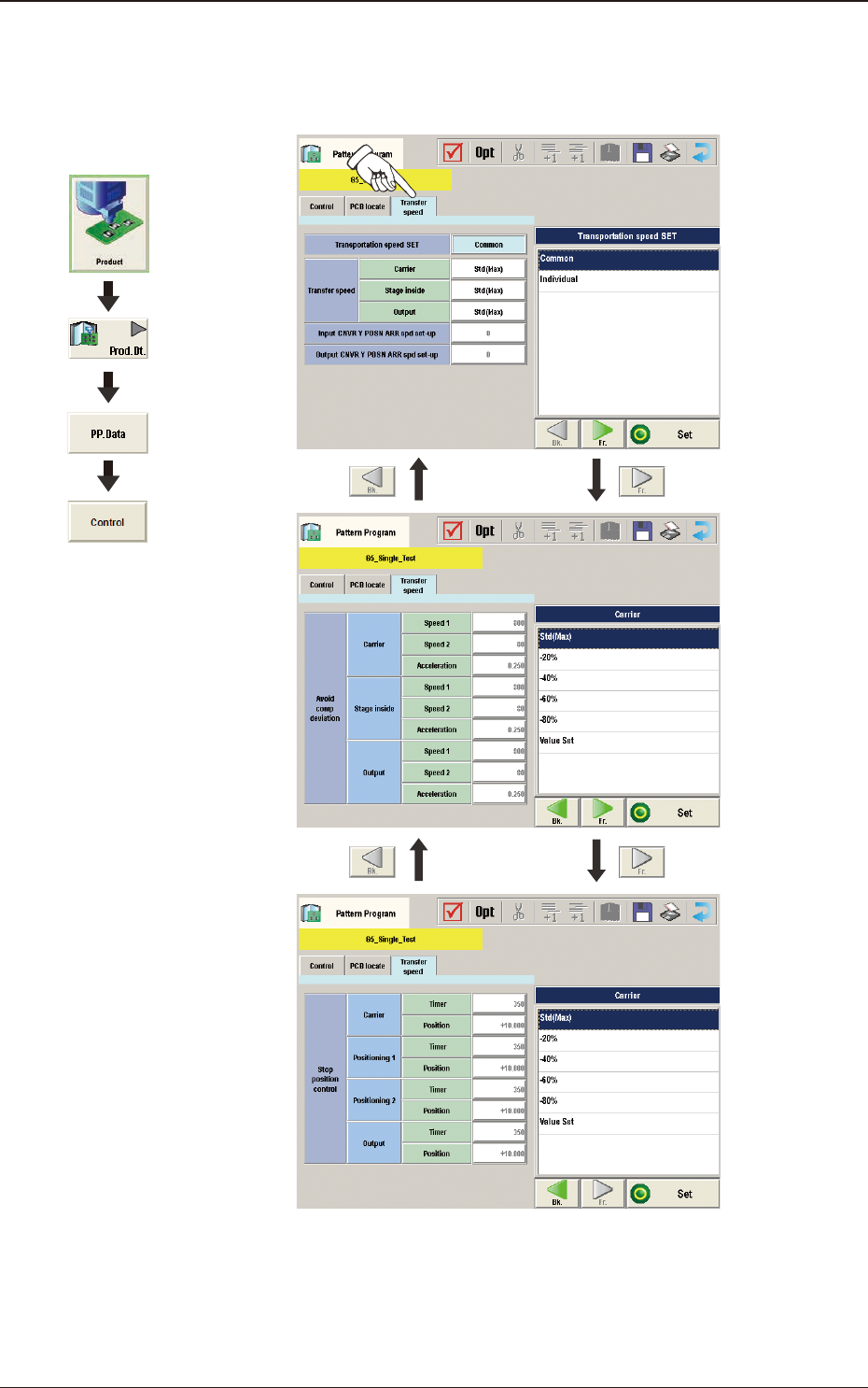 2OM-1751 2-47 1303-001 (D03_01) T ransportation speed SET Common : When selected, the transfer speed is set commonly to the machines in the line. Individual : When selected, the transfer speed is set individually for eac…