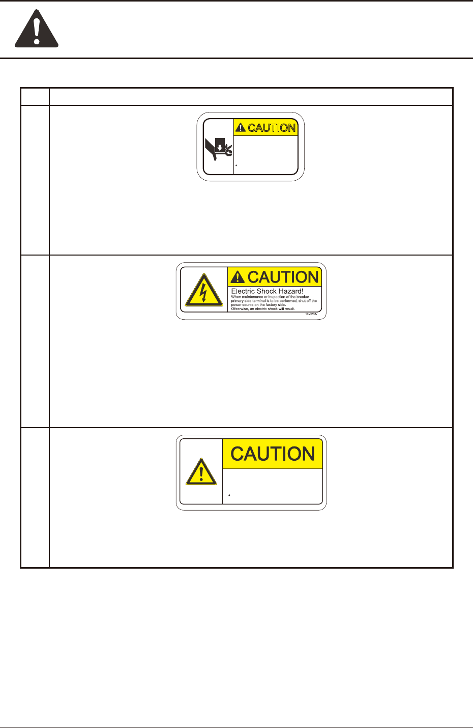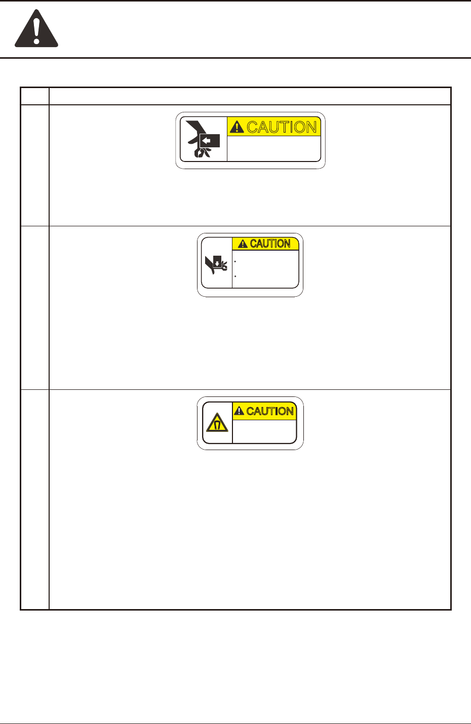 Safety Precautions Safe-26 1OM-1751 1305-002 5. Alert Labels No. Alert Labels and Description (7) CAUTION 10-0146- Do not let your finger get caught in this. An injury will result. Description When a covers (door type)…