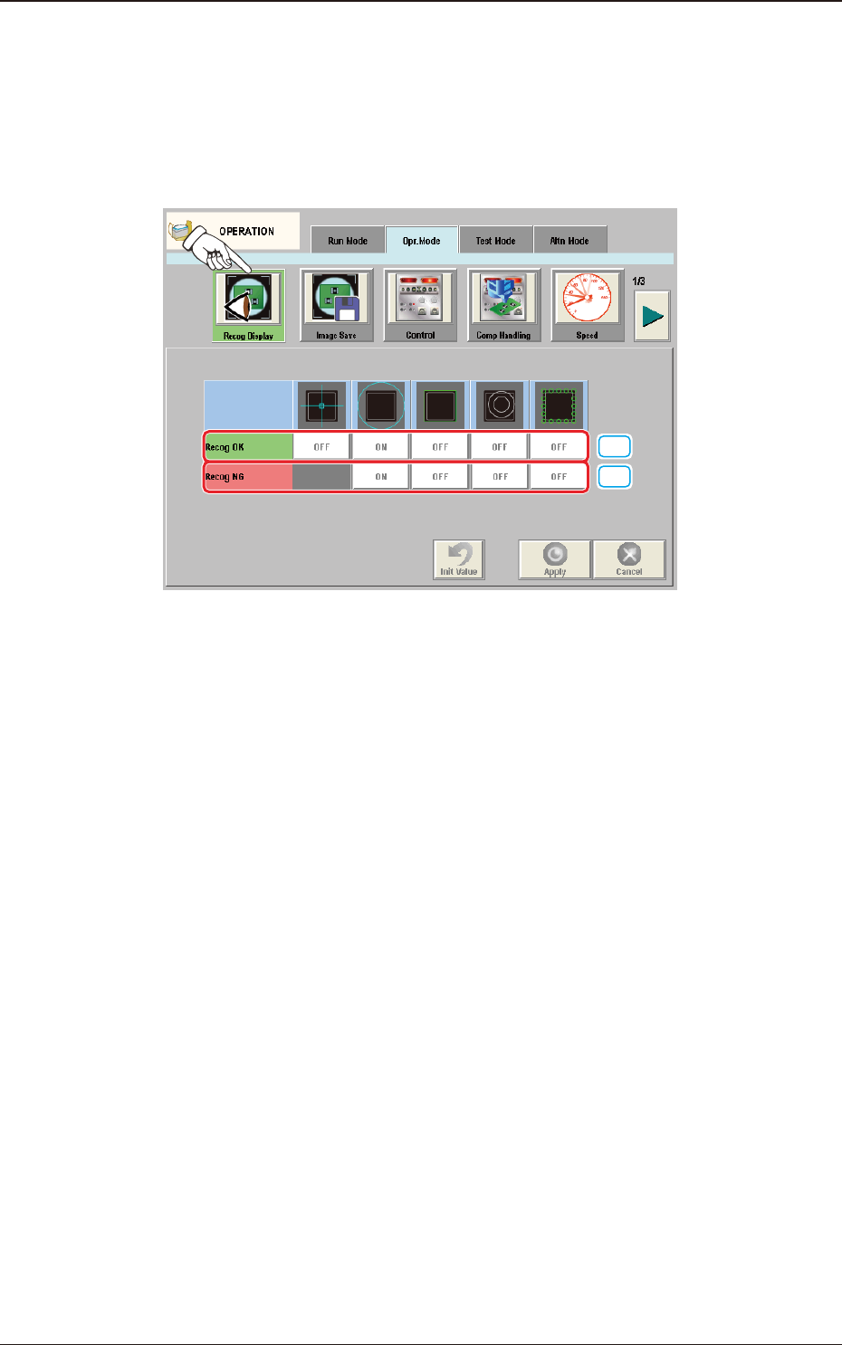 2OM-1751 1-31 1303-001 4.2.1 Recog Display When the [Recog Display] button is pressed on the "Opr.Mode" tab sheet, the following window appears. In this window, the graphic display setting when the recognition …