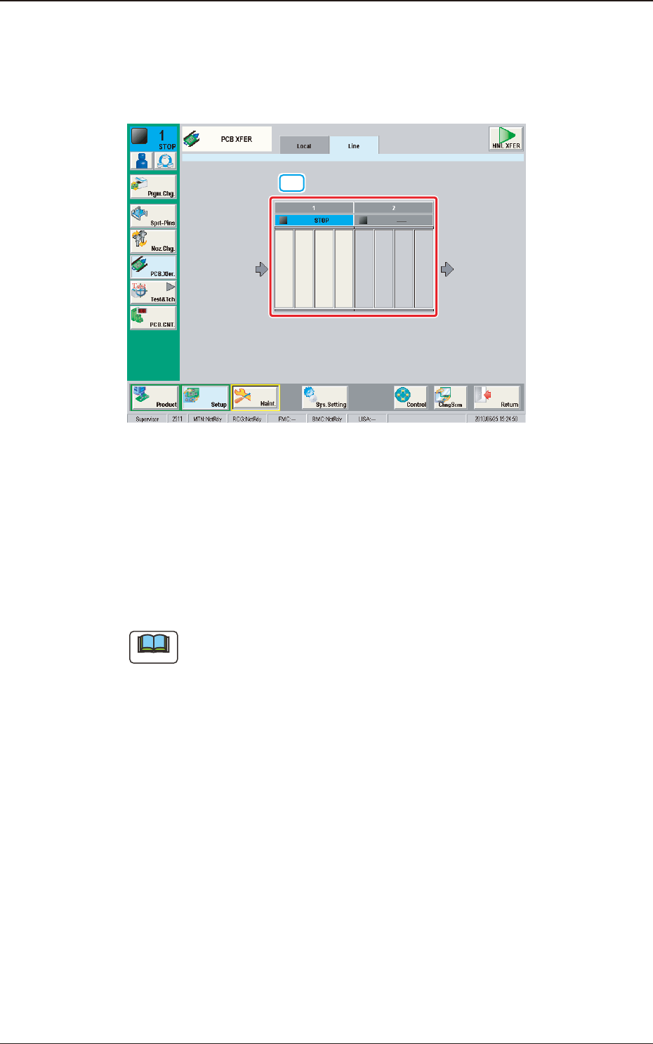 2OM-1751 6-27 1303-001 6.3 "MNL XFER" Window This "MNL XFER" window enables the operator to transfer a PCB manually. [2] [2] [4] [3] [1] F2F31 [1] Conveyor Image Display Section Each block of the conv…