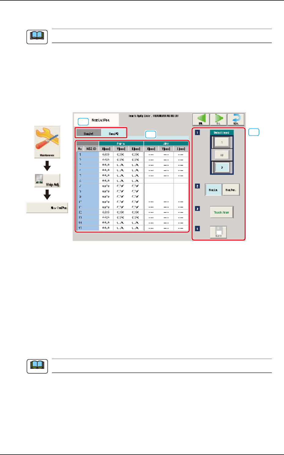 (2) Press the [Teach Start] button. (The designated head (No. 1 or 2) is moved to the specified