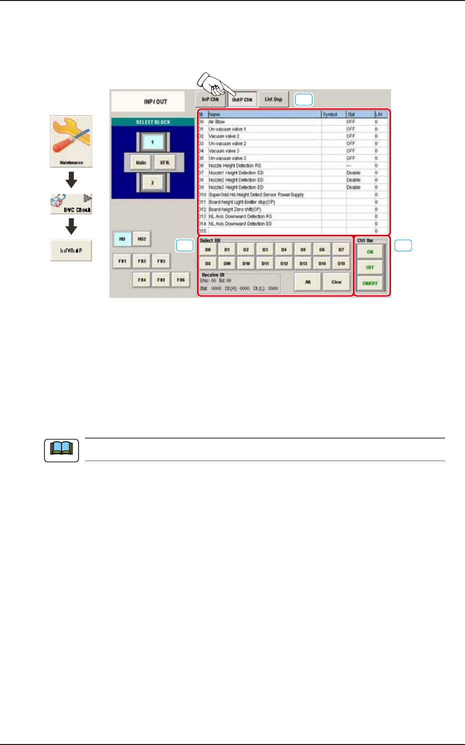 EUKYX 1-63 199-3100 6.1 INP / OUT 6. 1 .2 OutP Chk Pressi ng the [O utP Chk] button on the "INP/ OUT" window d isp la ys the fol low in g win dow . Che ck the sensor out put status. [1] [2] [3] Graphic Developm…