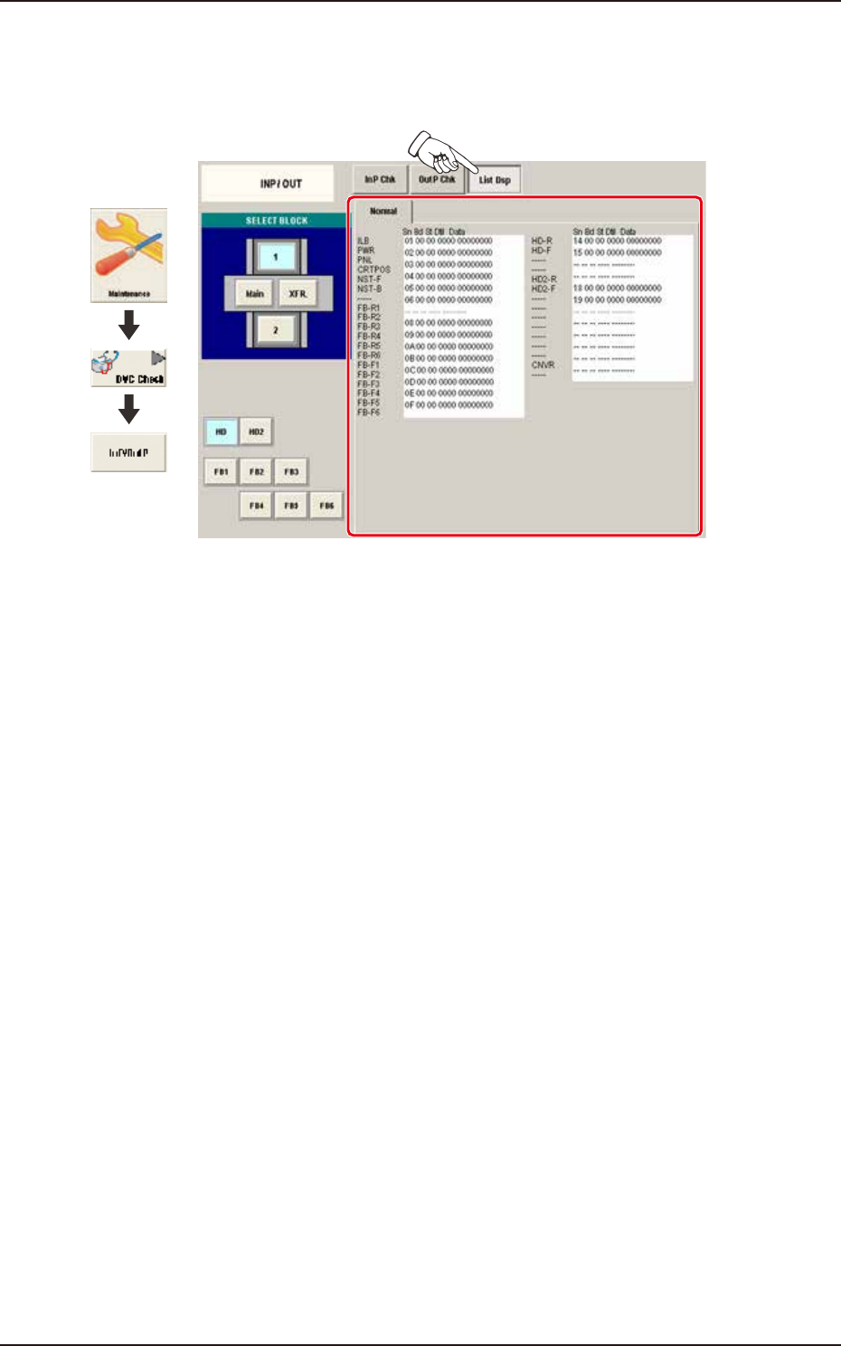 Pressing the [List Dsp] button on the "INP/OUT" window displays the following window. Check the