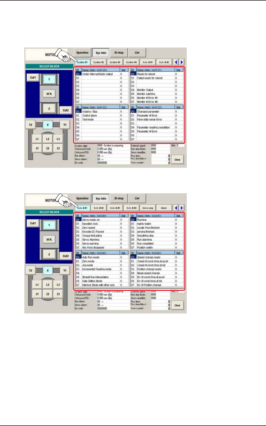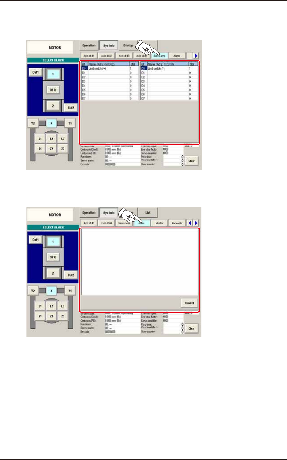 EUKYX 1-70 199-3100 6.2 MOTOR (3 ) Ser vo amp When the [ Ser vo amp] but ton is pressed on the "Sys Inf o" wi ndow , the " Ser vo amp" wi ndow app ear s. F3A60A (4) A la rm When the [Alarm] button is …