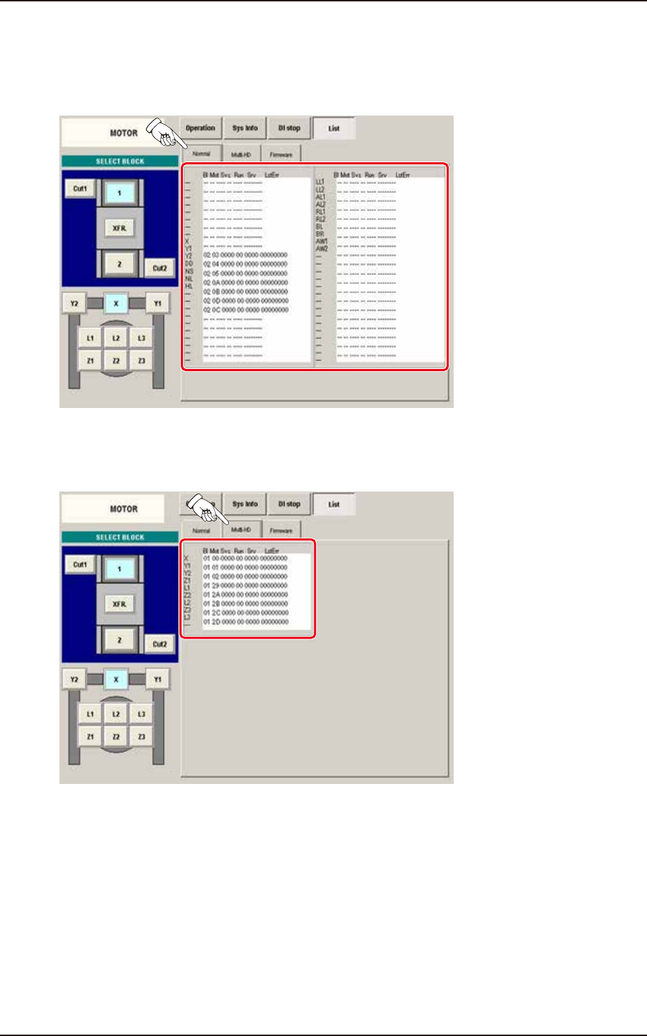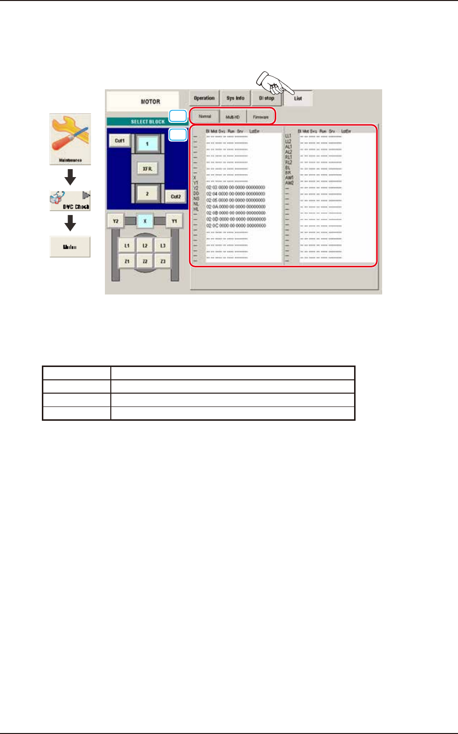 EUKYX 1-74 199-3100 6.2 MOTOR 6.2 .4 List Pressi ng the [List] but ton on the "MO T OR" windo w dis pl a ys the fol lowi ng wi nd ow . The window di spl a ys the li s t of status in ea ch section. [1] [2] Graph…
