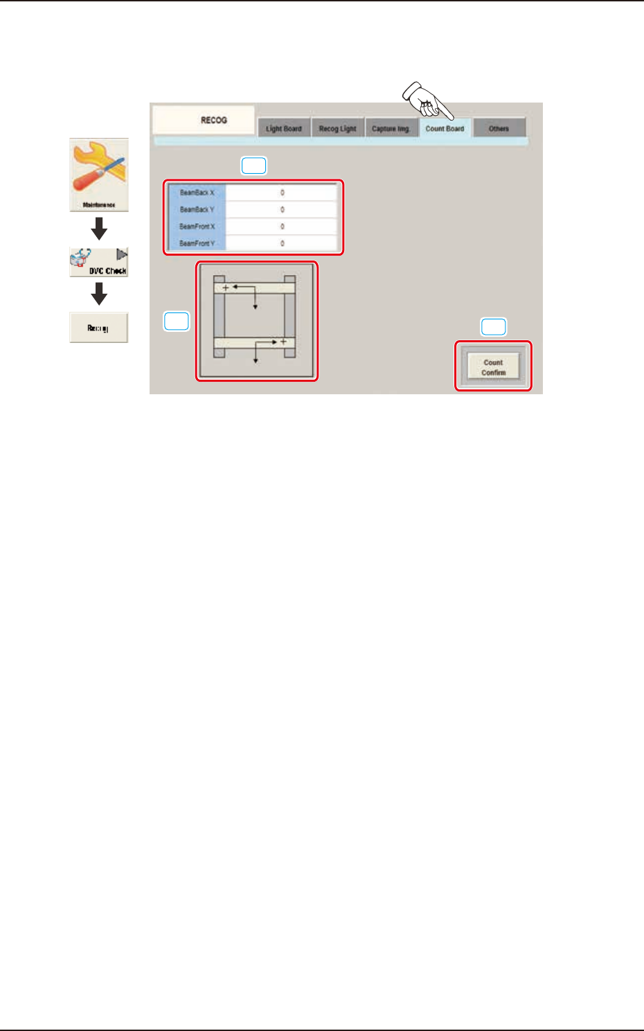 pressing the beam manually and pressing the [Count Confirm] button, are confirmed.