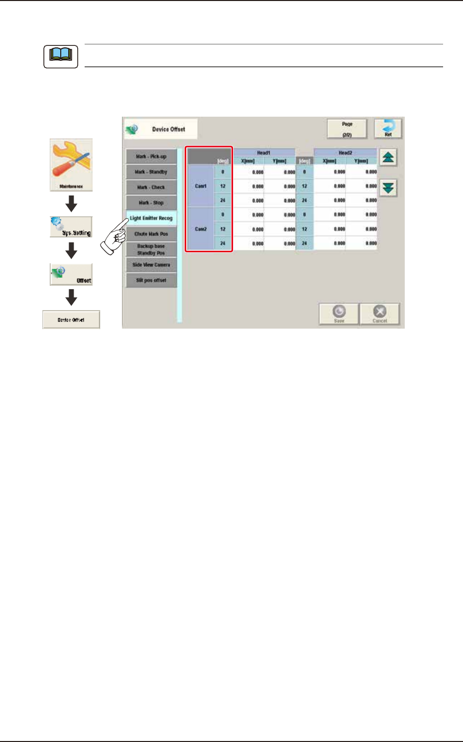 Pressing the [Light Emitter Recog] tab on the "Device Offset" window displays the following
