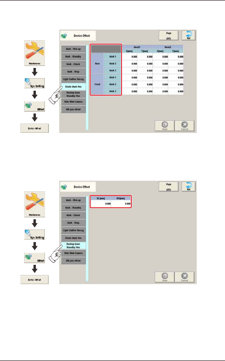 Pressing the [Chute Mark Pos] tab on the "Device Offset" window displays the following window.