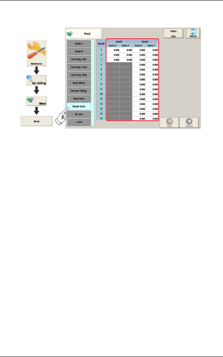 Pressing the [Nozzle Incln] tab on the "Head" window displays the following window.