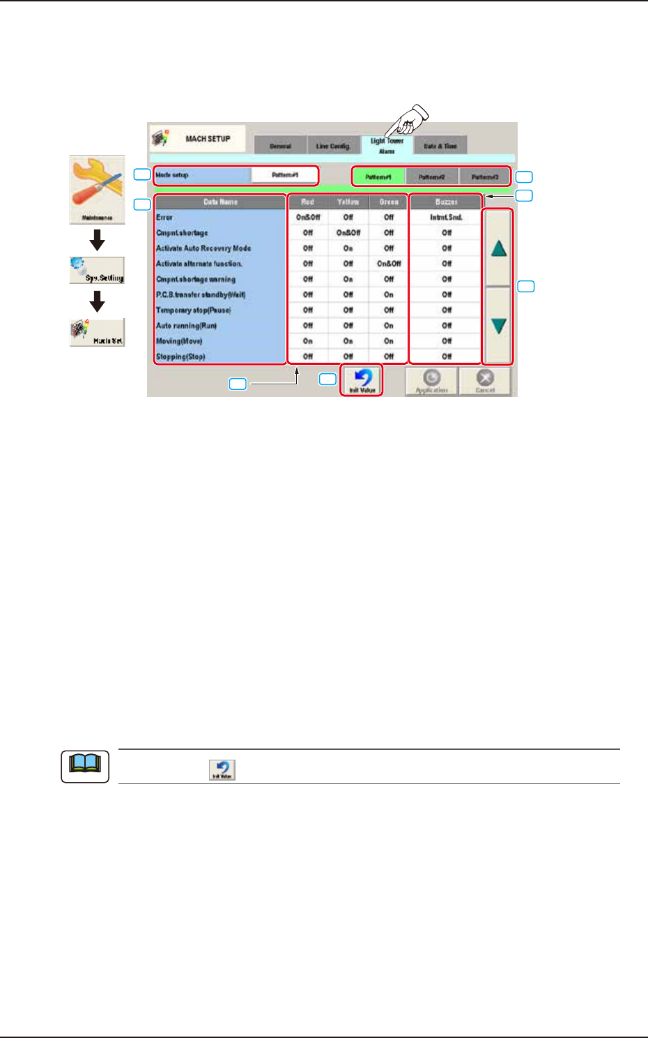 EUKYX 2-75 199-3100 4.3 Light T ower Alarm 4.3 Light T ow er A larm Pressi ng the [Light T ower Al arm ] tab on the "M ACH S ETUP " windo w di spl a ys the fol lowi ng wi ndow . Set the color of tow er l igh t …