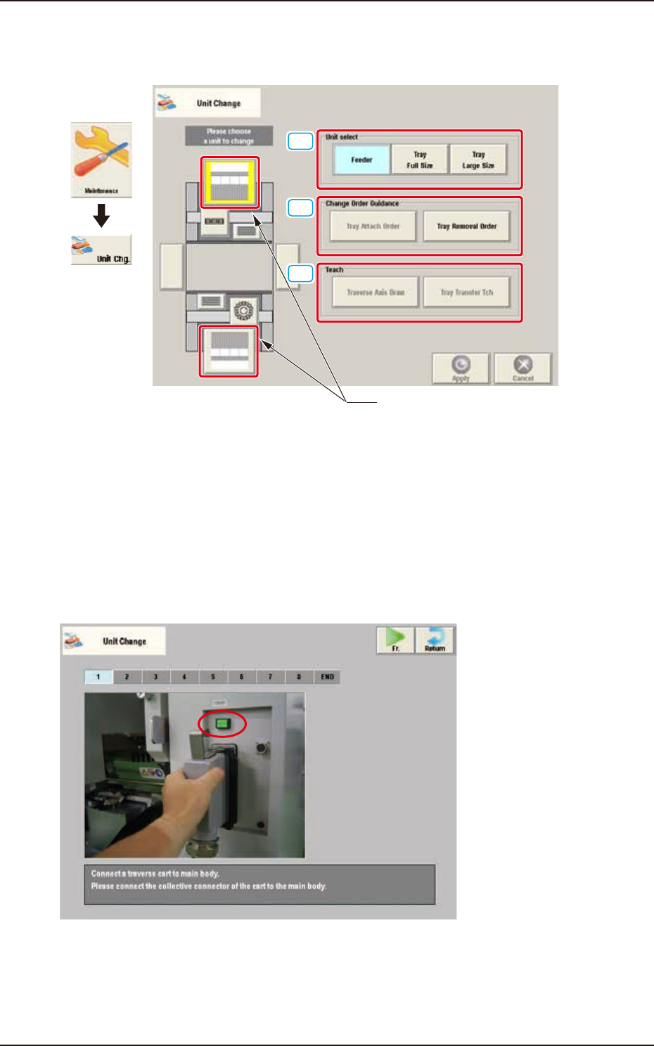 Refer to "Chapter 3: Maintenance Menu" in "GS-FP600 Multi-Layer Tray Feeder" for details.