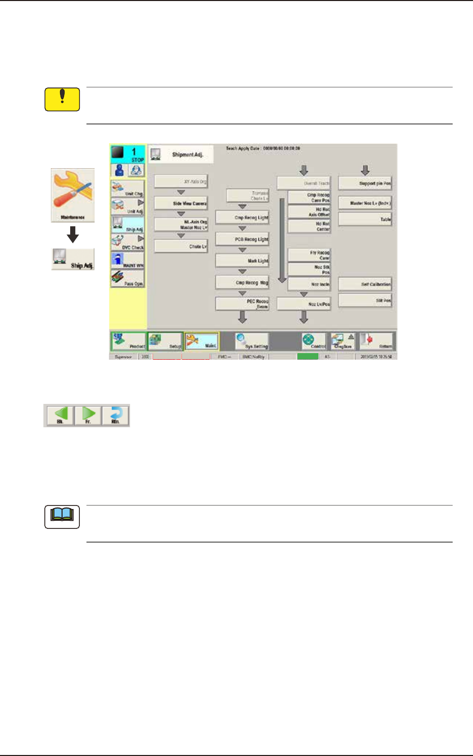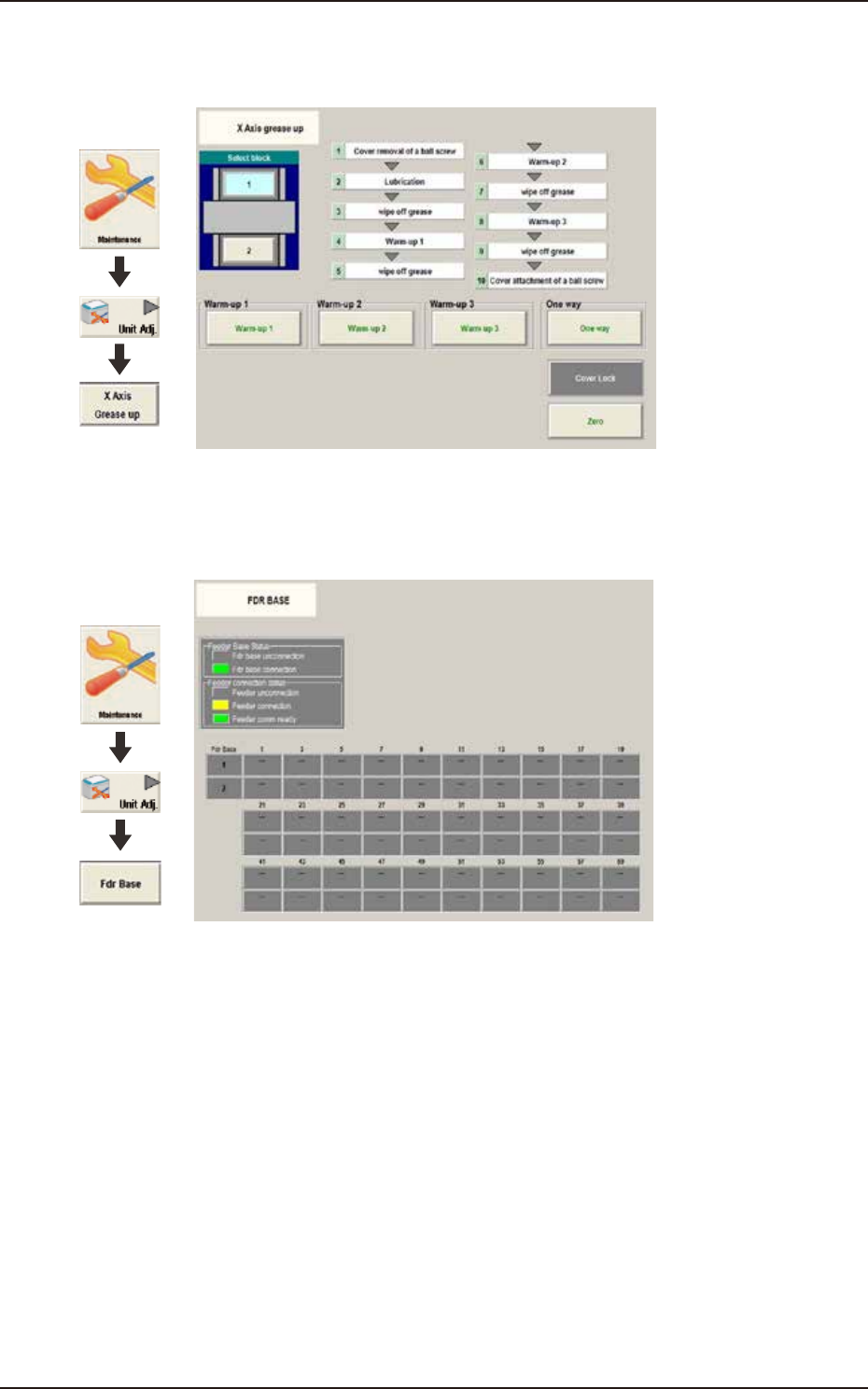 EUKYX 1-23 199-3100 4.3 CONVEYOR 4.3.3 X A xis grease up Fol low the instructions on the wi ndow to app ly grease to X -axis. Graphic Development F3A95 4.3 .4 FDR BAS E The status colors sho w t he connection status of f…