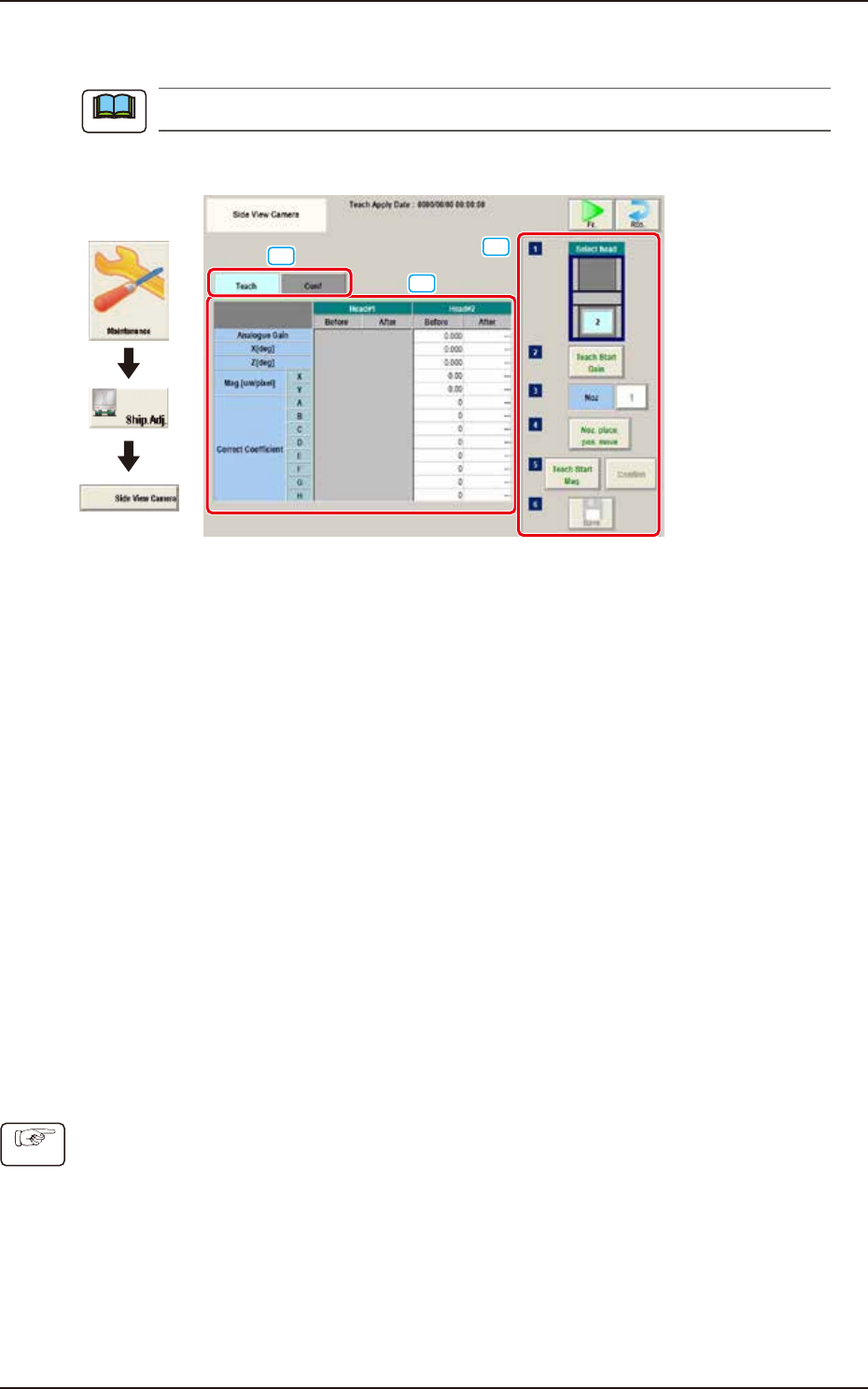 EUKYX 1-25 199-3100 5. Shipment Adj. But to n Na m e T eac hing Outline Sid e Vi ew C am er a T eac hes the side view camera attac hed to each placement head. NL-A x is Or g M as ter N oz Lv The te ach ing f or avoi din …