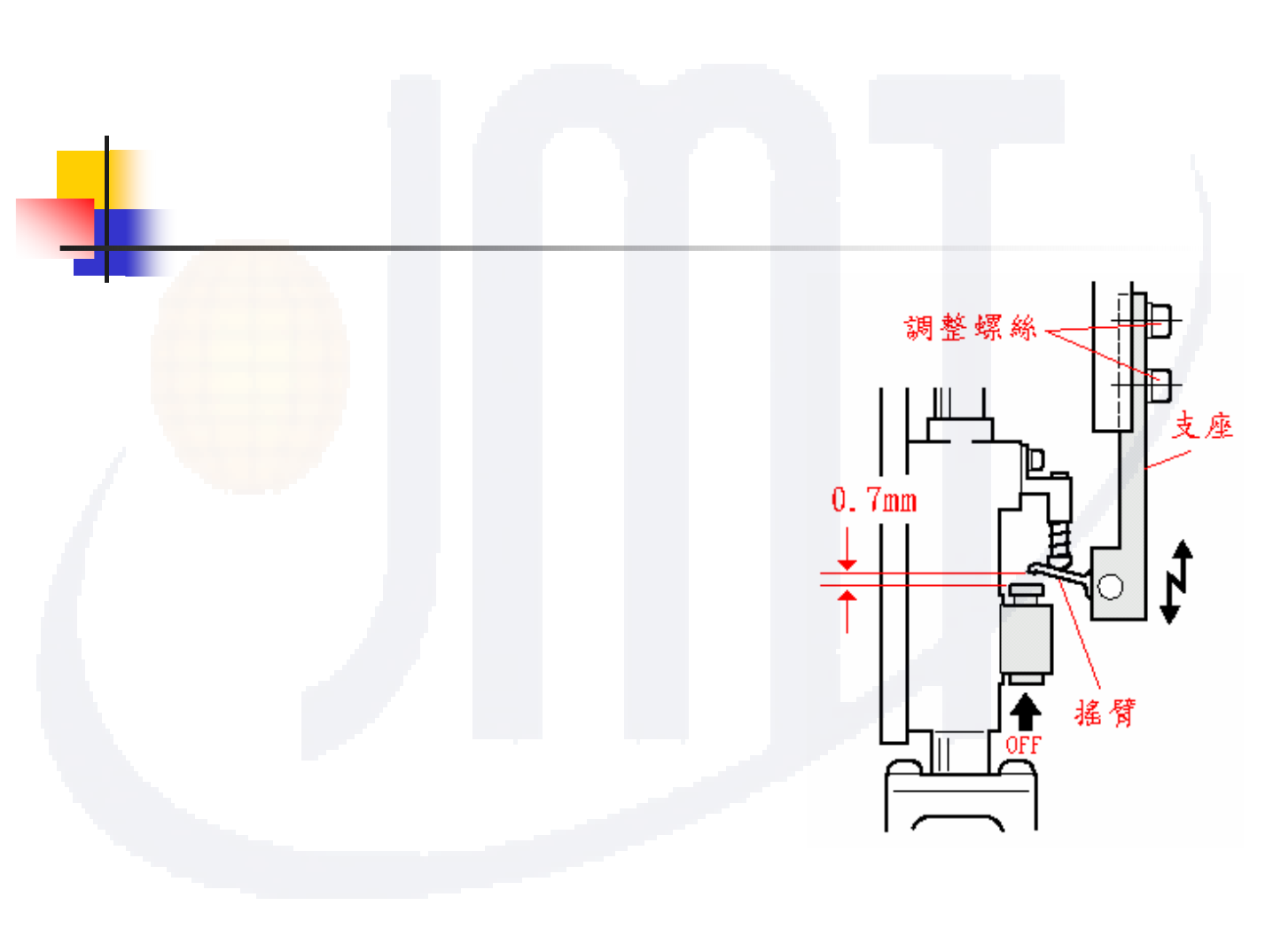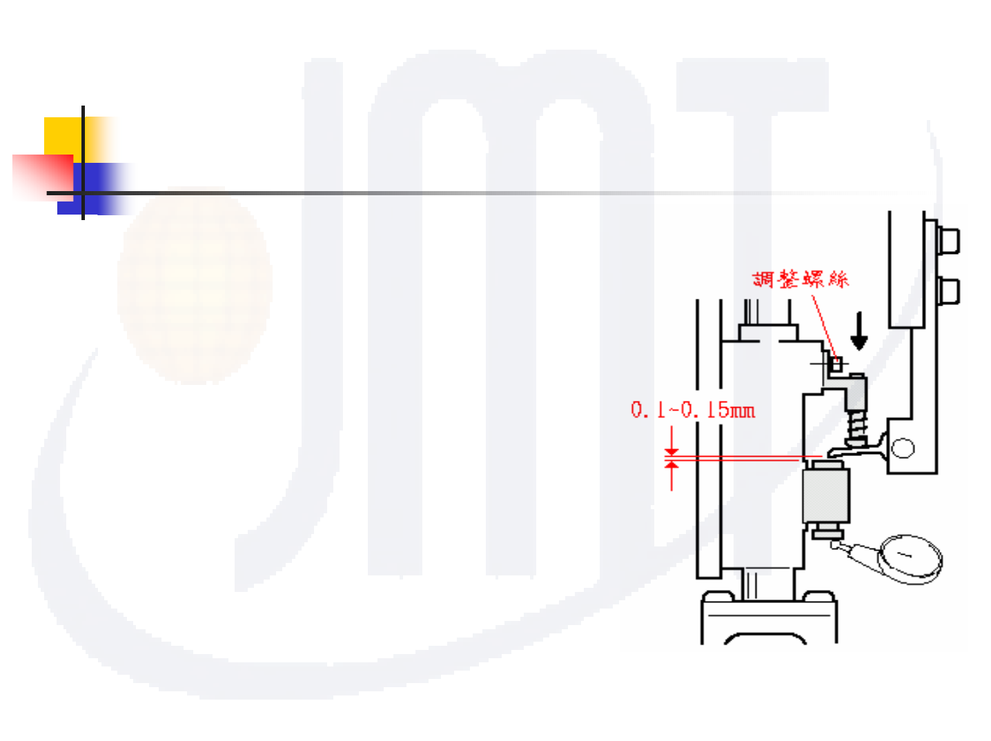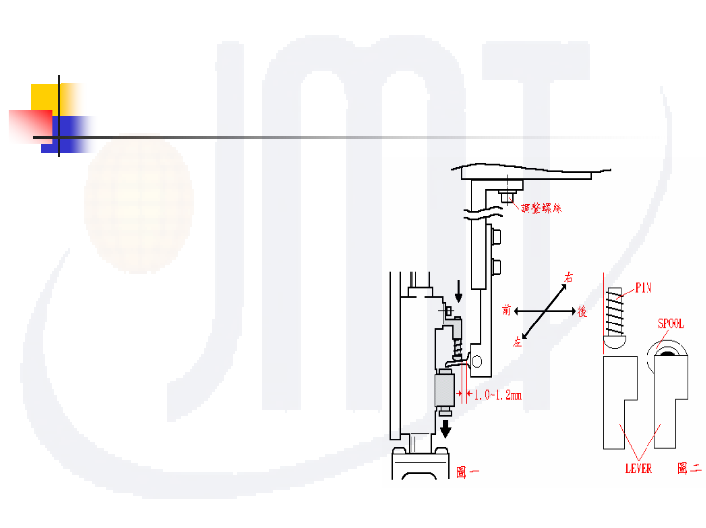 34 拾 壹、1st vacuum valve 二、搖臂前後/左右位置 1. 將CAM轉回0 0 進I/O將 1st pick-up 切 成ON。 2. 將CAM轉至約110 0 ~ 120 0 左右, 使真空閥門開放搖臂約在水平 位置,放鬆搖臂支座前後/左右 固定 螺 絲調整支座前後位置,使 驅動銷前緣與搖臂基部距 離 約 1 ~ 1.2mm 。 3. 將CAM轉到200 0 調整支座左右位置 ,使驅動銷左側外緣與搖臂左側 邊緣,剛好…