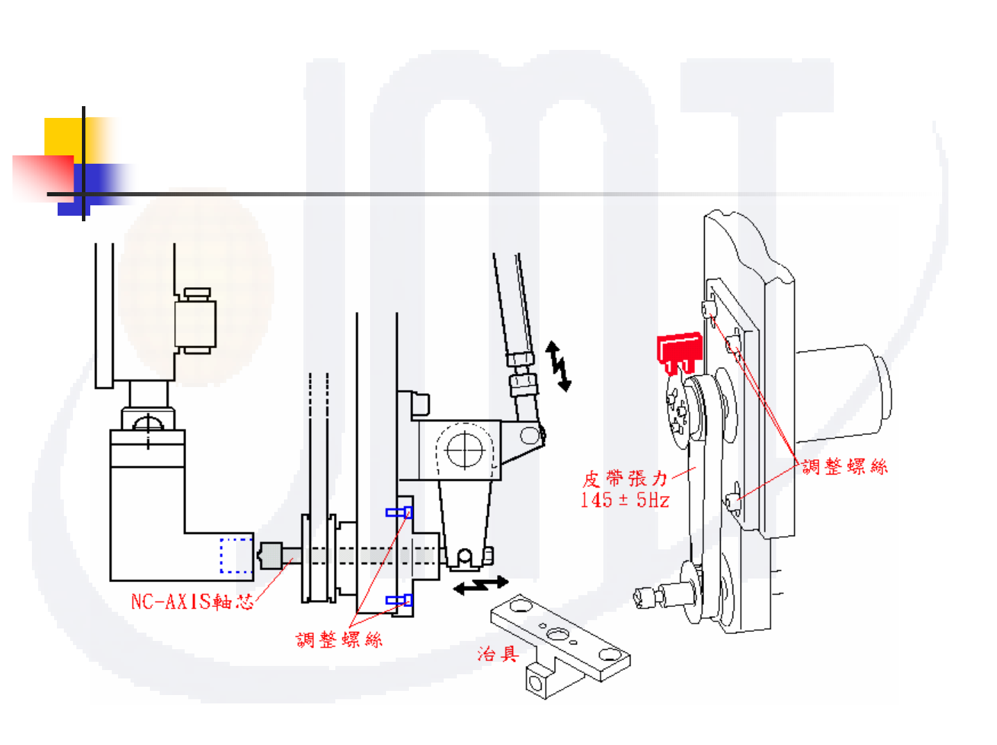 P.S : a.如果皮帶張力太緊導致支座位置調整困難,可先將馬達支座固定