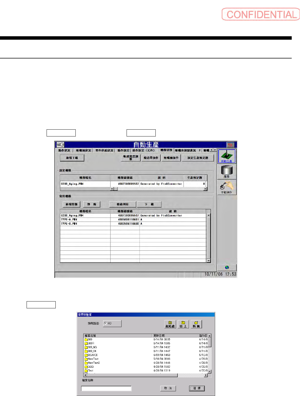 在机种切换画面,变更自动生产机种时,执行必要的交换操作,即设定机种文件。
