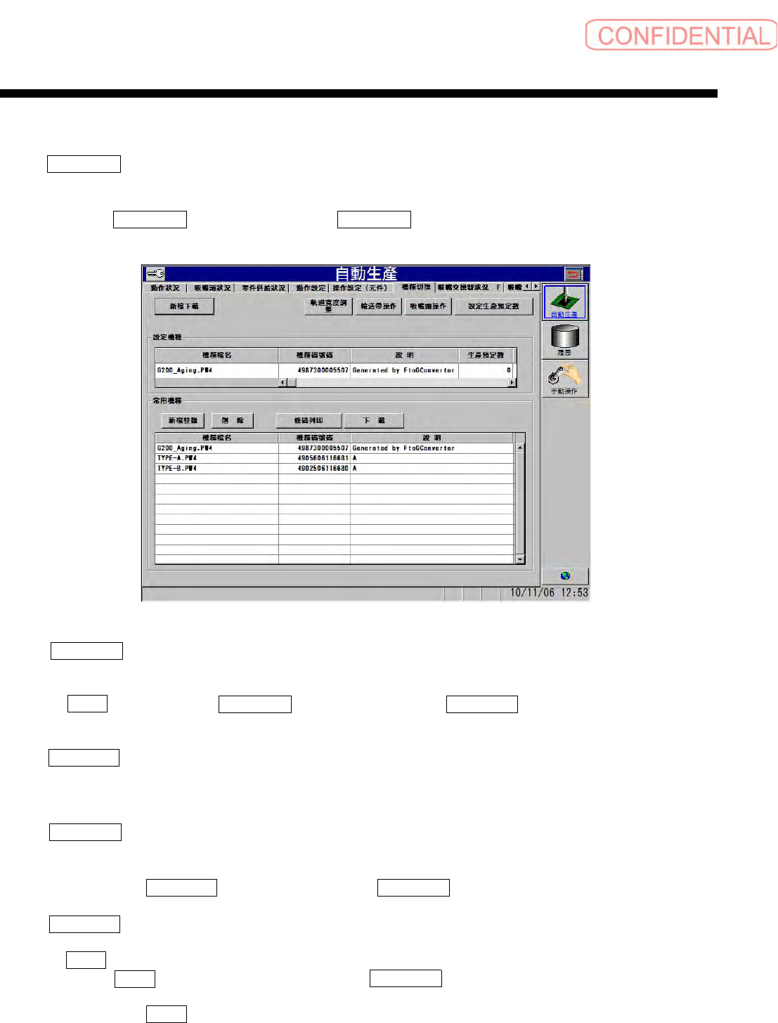 依顺序点击 自動生產 ( 自动生产 ) 菜单→ 機種切換 ( 机种切换 ) 标签会出现以下的画面。