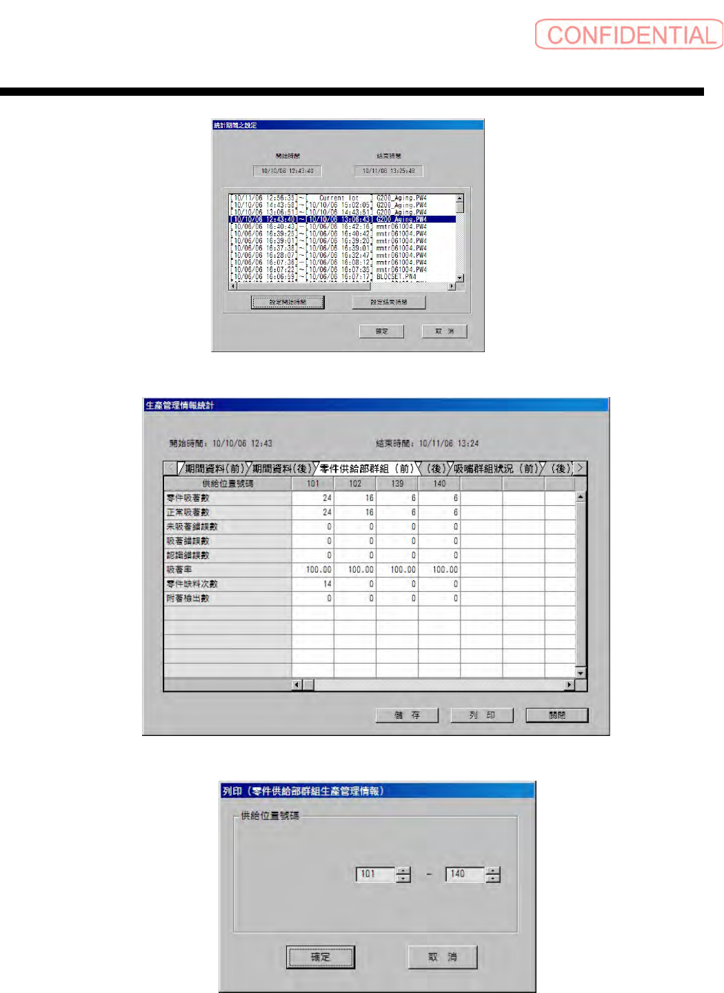 操作篇 3. 自动生产 电子零件装着机 SI-G20 0Mk3 (CS) 3-77 图 3.7.3-2 統計期間之設定 ( 统计期间的设定 ) 对话框 图 3.7.3-3 生產管理情報統計 ( 生产管理信息统计 ) 对话框 图 3.7.3-4 列印 (零件供給部群組生產管理情 報) ( 打印 (零件供给部群组生产管理信 息) ) 对话框