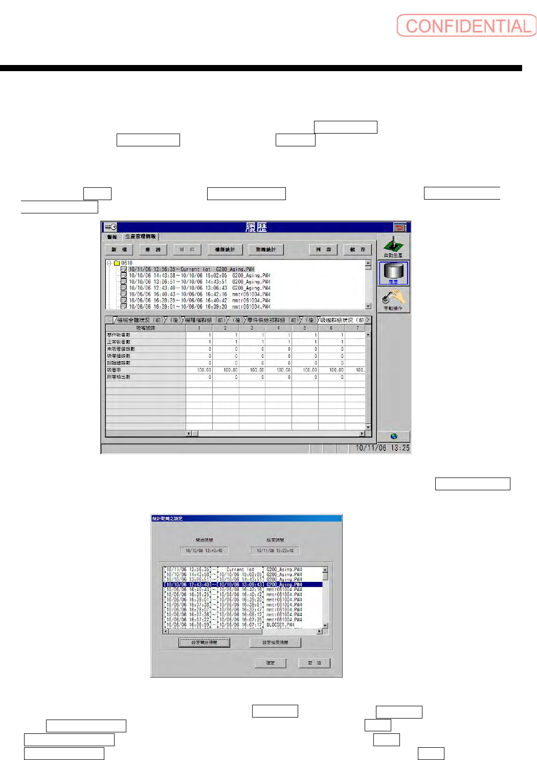 在列表的最上行表示文件为现在实行中的机种文件,以 “Current lot” 表示。 吸嘴群組狀況