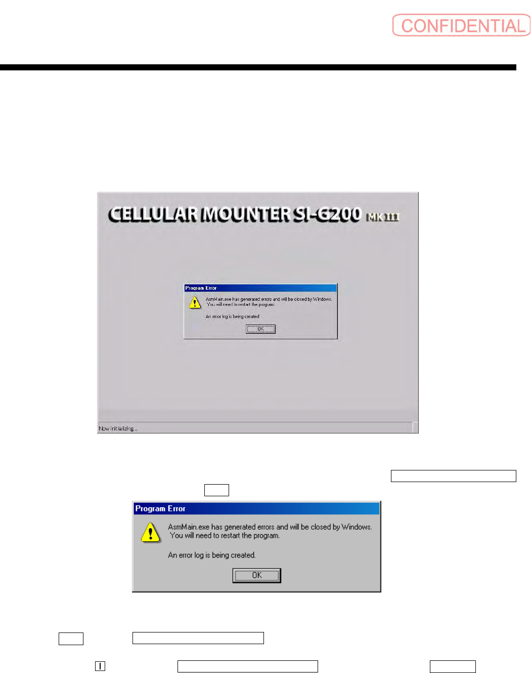 操作篇 3. 自动生产 电子零件装着机 SI-G20 0Mk3 (CS) 3-87 (2) 应用错误发生时的再激 活 应用错误发生时需要再激活 W indows 2000 。 依以下的操作顺序再激活 W indows 2000 。 [ 操作顺 序 ] SI-G200Mk3 激活后或在应用操作中发生应 用错误时,会表示以下的对 话框。对话表示后,请 按紧急停止钮,停止机器的动作。 图 3.8.2-1 Windows 2000 小博士对话框…