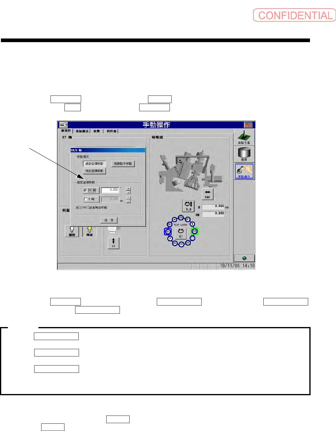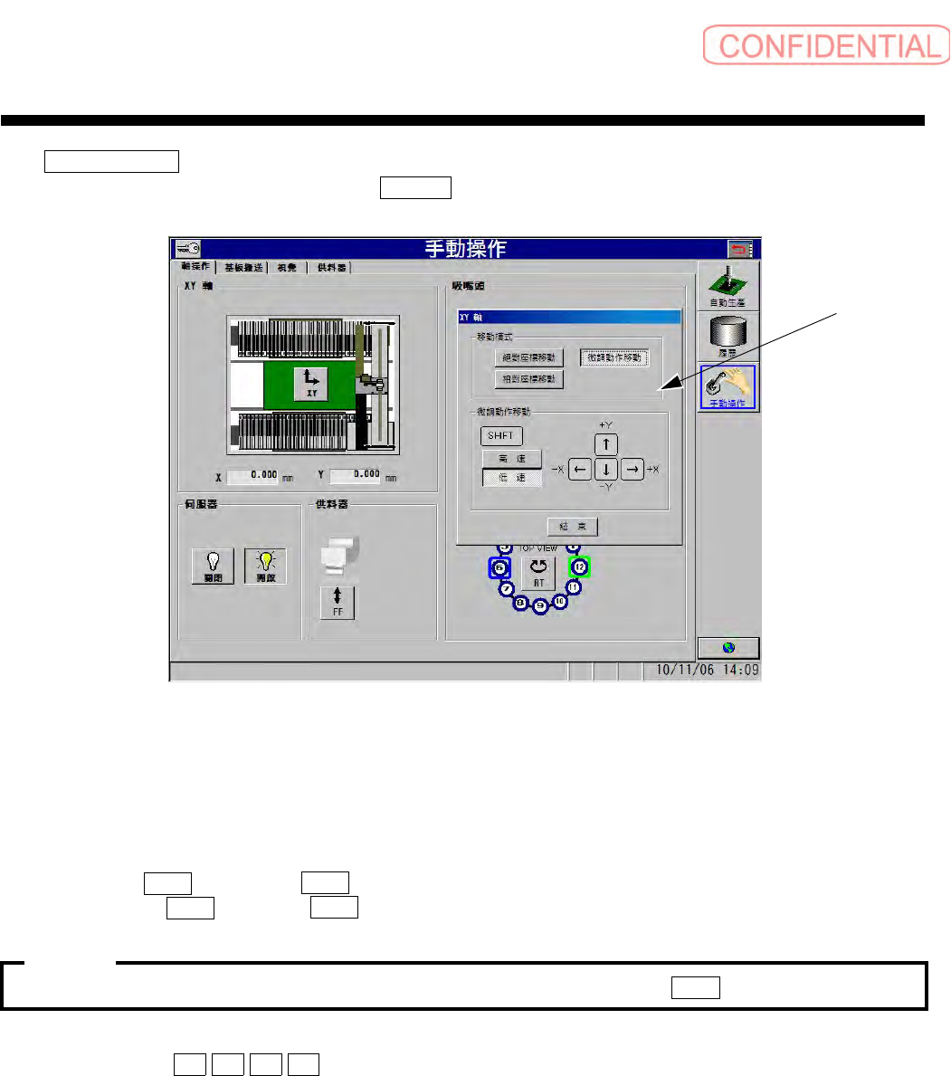 电子零件装着机 SI-G20 0Mk3 (CS) 4-5 操作篇 4. 手动操作 (3) 微調動作移動 ( 微调动作移动 ) 指定微调动作移动时,会显示以下 的 XY 軸 (XY 轴 ) 对话框 1 。 图 4.1.1-2 手動操作- 軸操作 ( 手动操作- 轴操作 ) 画面 XY 轴微调动作移动的顺序 如下。 [1] 指定移动速度。 以下的方法可指定移动速度。 方法 : 点击 高速 ( 高速 ) 或 低速 ( 低速 ) 钮。 →指定 …