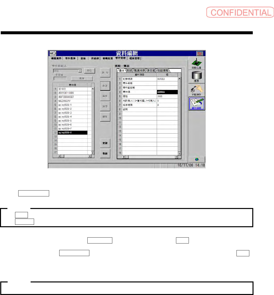 修正、删除已存零件资料内容时,请参照