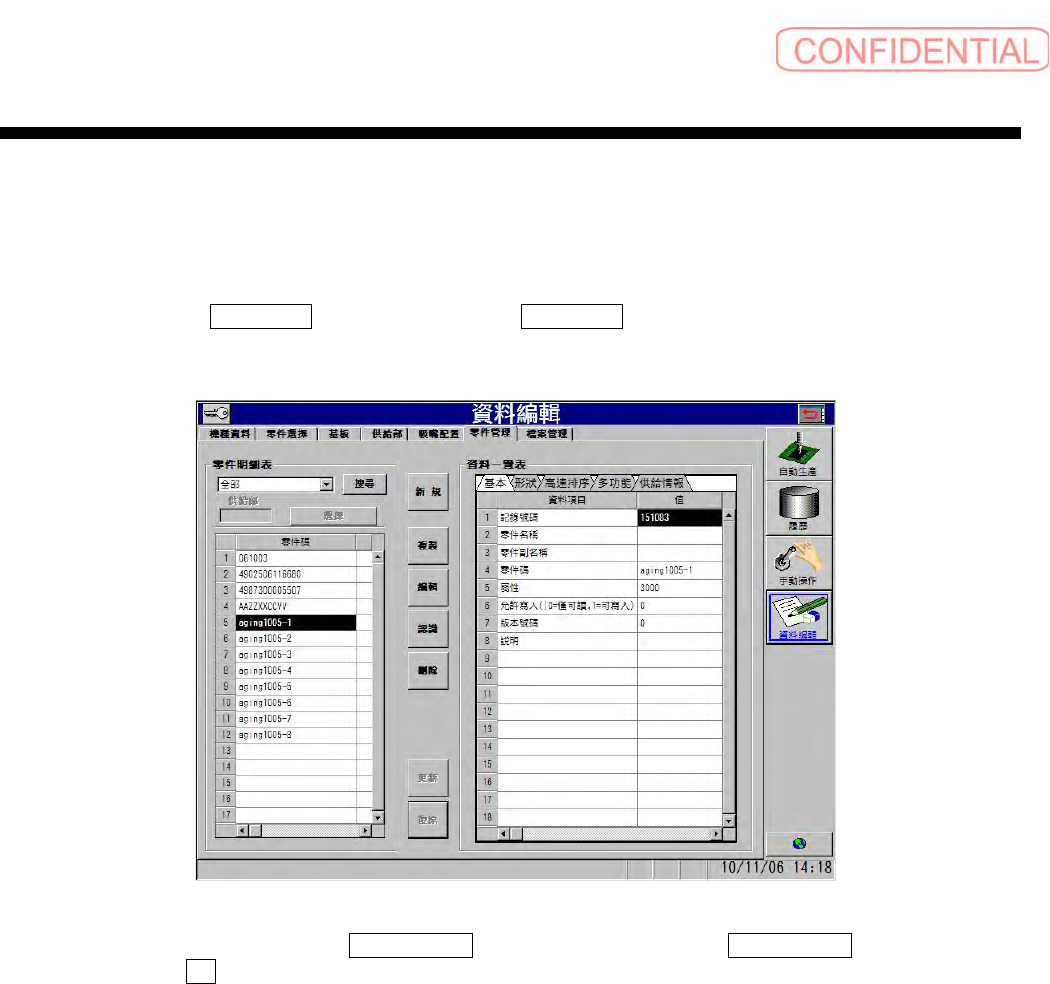 操作篇 5. 资料编集 5-10 电子零件装着机 SI-G200Mk3 (CS) 图 5.1.1 -12 資料編輯-零件管理 ( 资料编辑-零件管理 ) 画面 在 資料一覽表 ( 资料一 览表 ) 框内修正复制的资料明细 ,请修正必要项目的内容。 · 基本 ( 基本 ) 标签的记录号码为自动登 录号码,无必要修正。 · 零件碼 ( 零件码 ) 需要输入任意的唯一号码 。 制作欲登入零件数据 , 请点击 零件管理 ( 零件管 理 ) 画面…