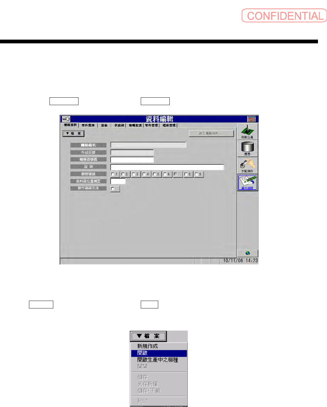 点击 資料編輯 ( 资料编辑 ) 菜单的 機種資料 ( 机种资料 ) 画面的 ▼檔案 ( ▼文件 ) 钮,会出