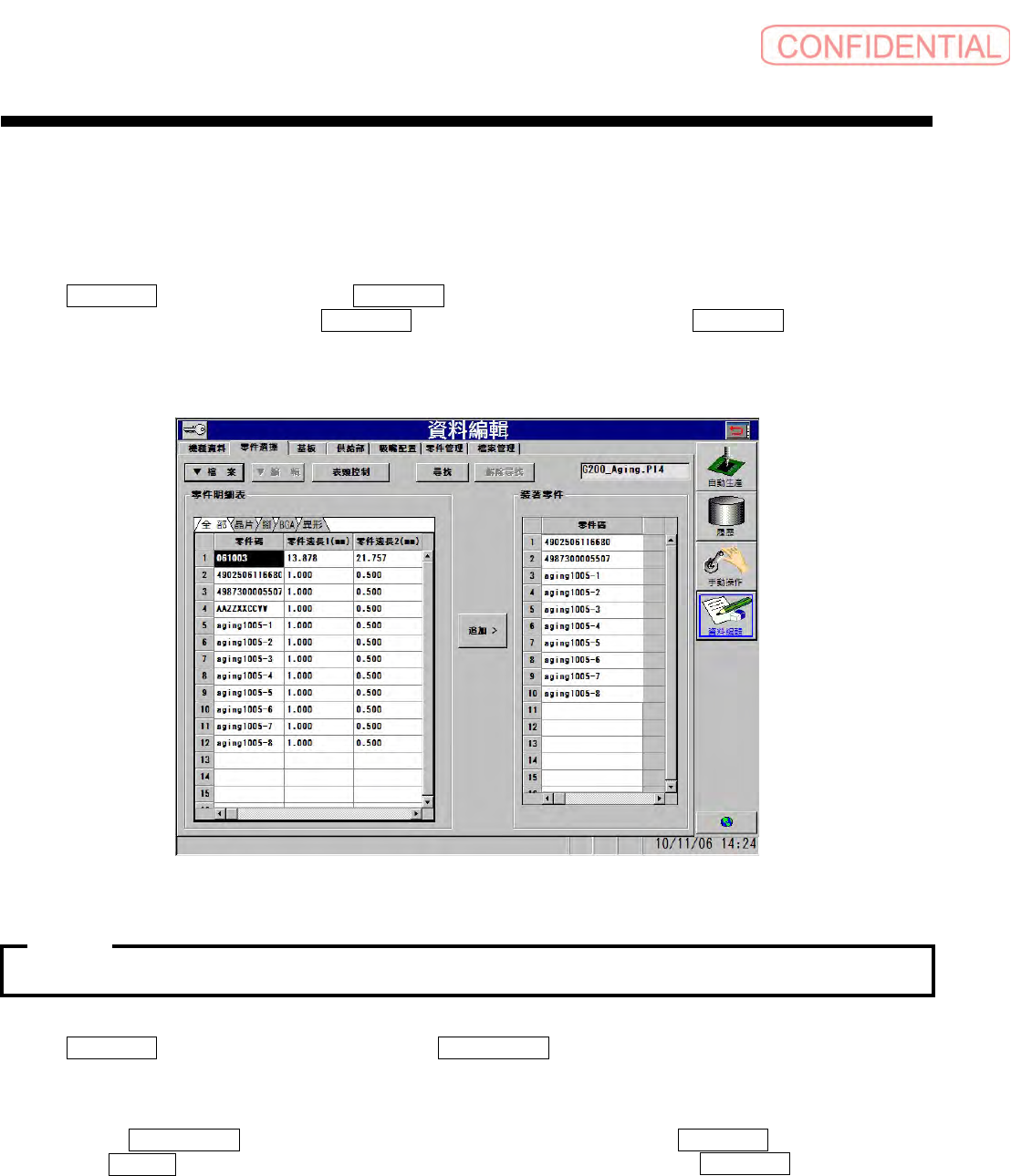 追加> ( 追加> ) 钮时,在机种文件追加选择的零件数据至使用 裝著零件 ( 装着零件 )