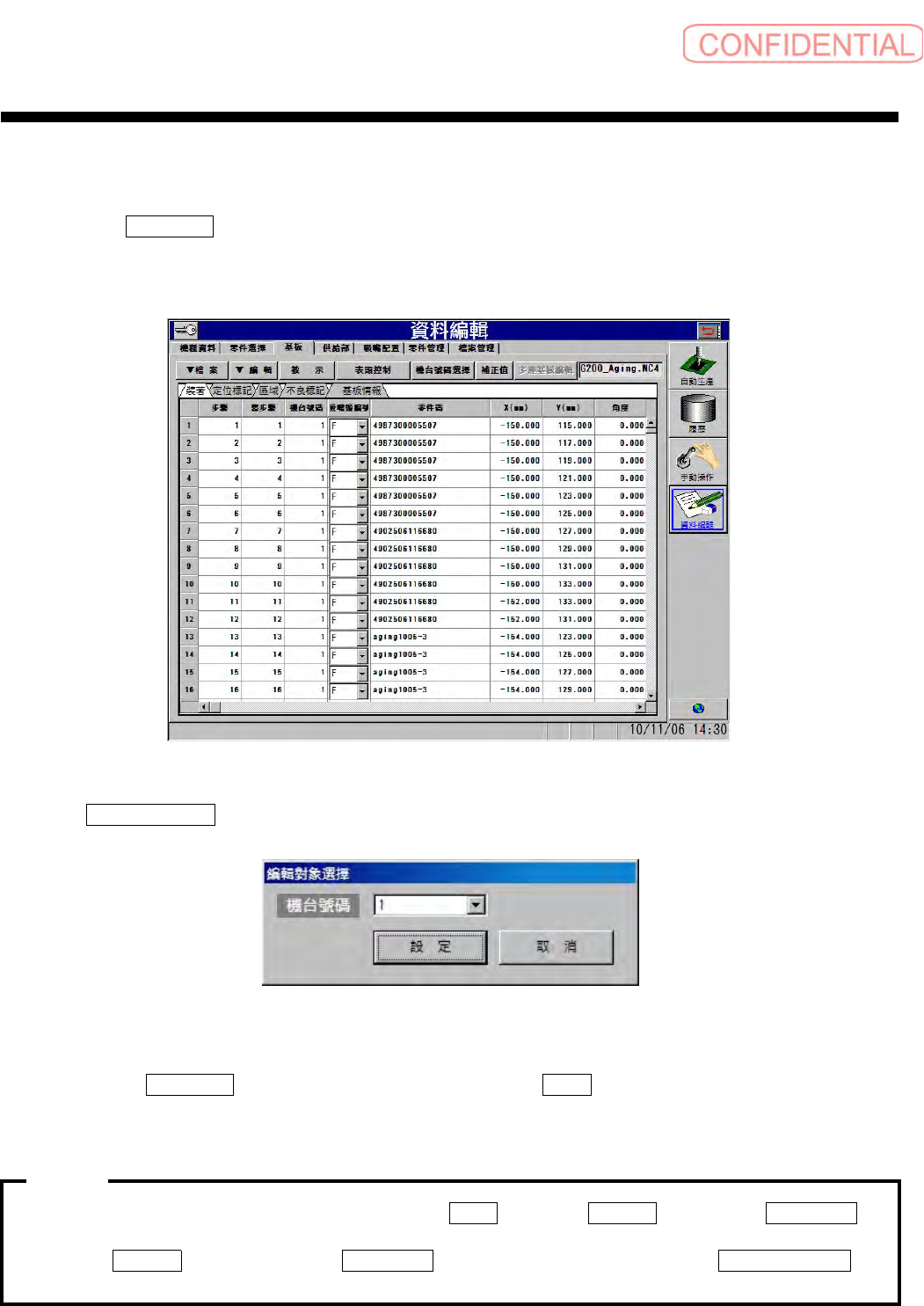 操作篇 5. 资料编集 电子零件装着机 SI-G20 0Mk3 (CS) 5-85 (6) 机台号码的选择 [ 操作功 能 ] 在连接使用的机器时,使用在输入 时的动作资料。 表示指定 机台号码 及指 定机台的资料,可执行编辑·储存 等。 [ 操作顺 序 ] 图 5.4.5-1 1 資料編輯—基板 ( 资料编辑-基板 ) 画面 点击 編輯對象選擇 ( 编辑对象号码 ) 钮,会表示 以下的编辑对象选择对话框。 图 5.4.5-12 編輯對…