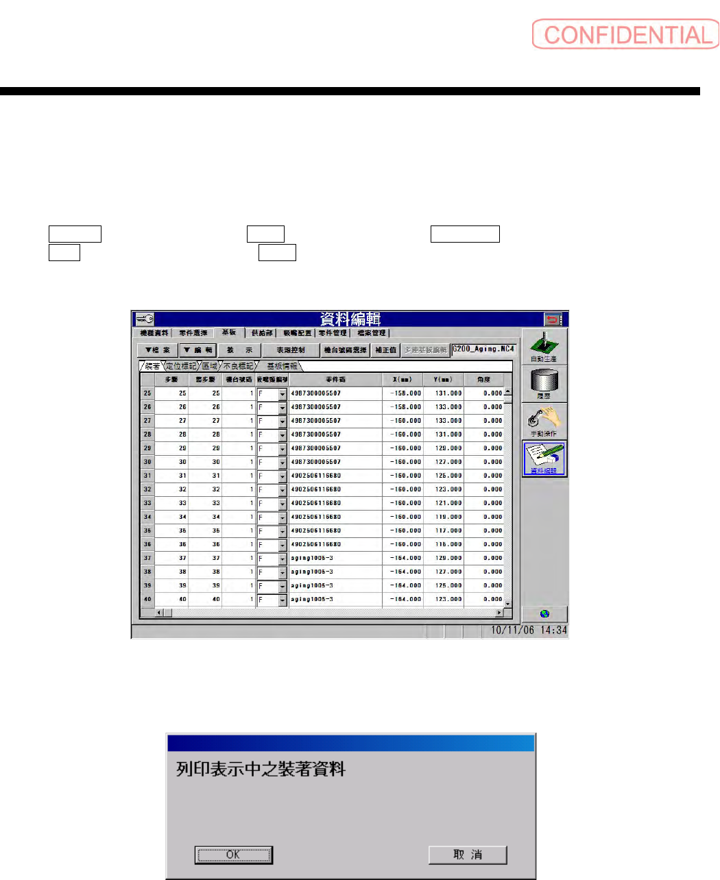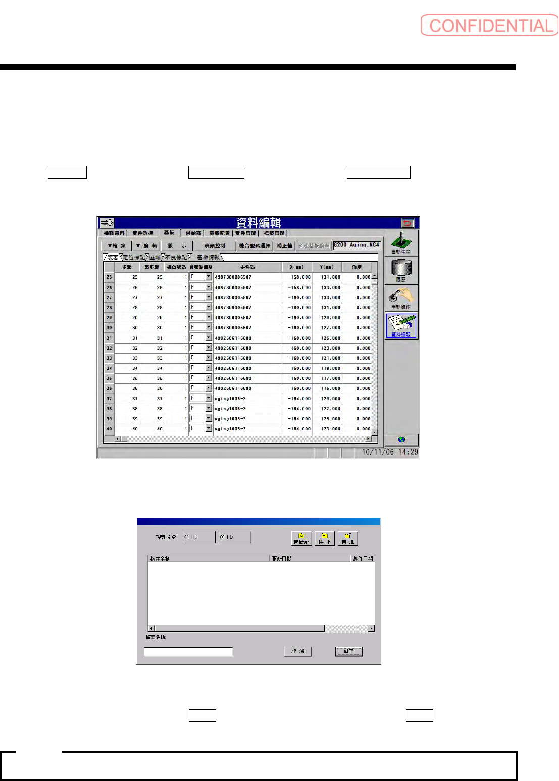 操作篇 5. 资料编集 5-94 电子零件装着机 SI-G200Mk3 (CS) 5.4.5.3 参照的内容存储 [ 操作 功能 ] 使用于参照的内容存储时。 不可从后侧进行存储。 [ 操作 顺序 ] 点击 ▼檔案 ( ▼文件 ) ,请 选 择 Ref. 儲存 (Ref. 储存 ) ,出 现 機種檔 選擇 ( 机种文件选择 ) 对 话框。 图 5.4.5-27 資料編輯—基板 ( 资料编辑-基板 ) 画面 图 5.4.5-28 选择机种…