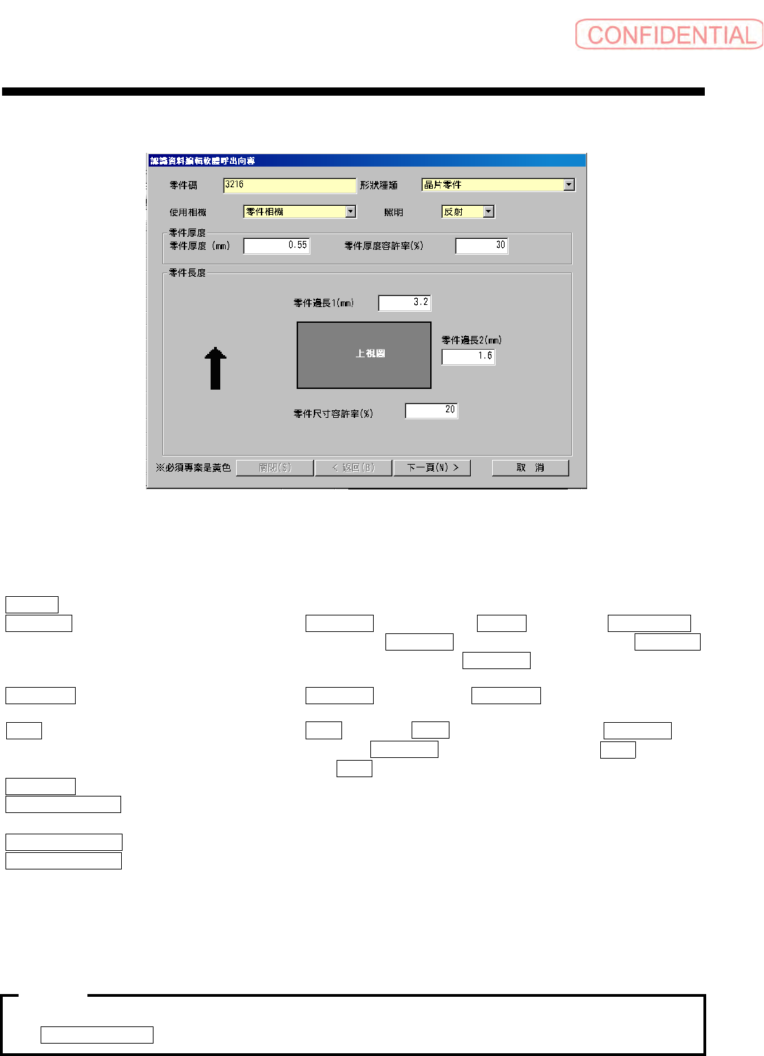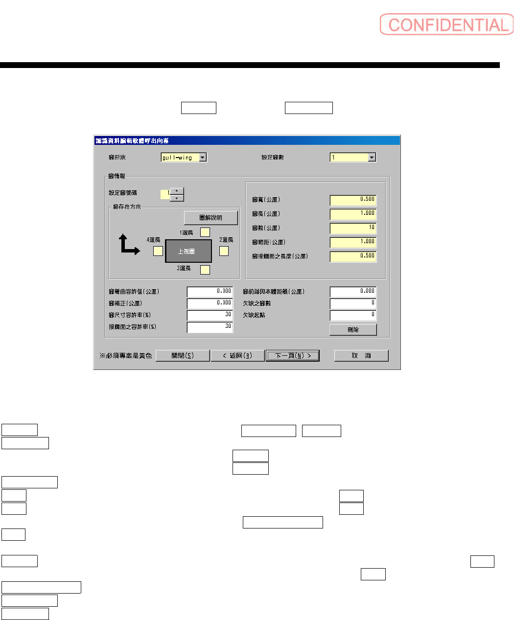 零件认识数据制作篇 1 . 操作 电子零件装着机 SI-G20 0Mk3 (CS) 1-7 1.2.2 脚信息输入画面 基本信息输入画面上形状种类,选择 腳零件 ( 脚零件 ) 或 異型零件 ( 异形零件 ) ( 有 LEAD) 时显 示。 图 1.2.2-1 腳情報 ( 脚信息 ) 输入 画面 在成为必须项目的黄色区域内输入 值。 腳形 狀 ( 脚 z 形状 ) :在 gull-wing 、 j-lead 中选择。 設定 腳數 ( 设…