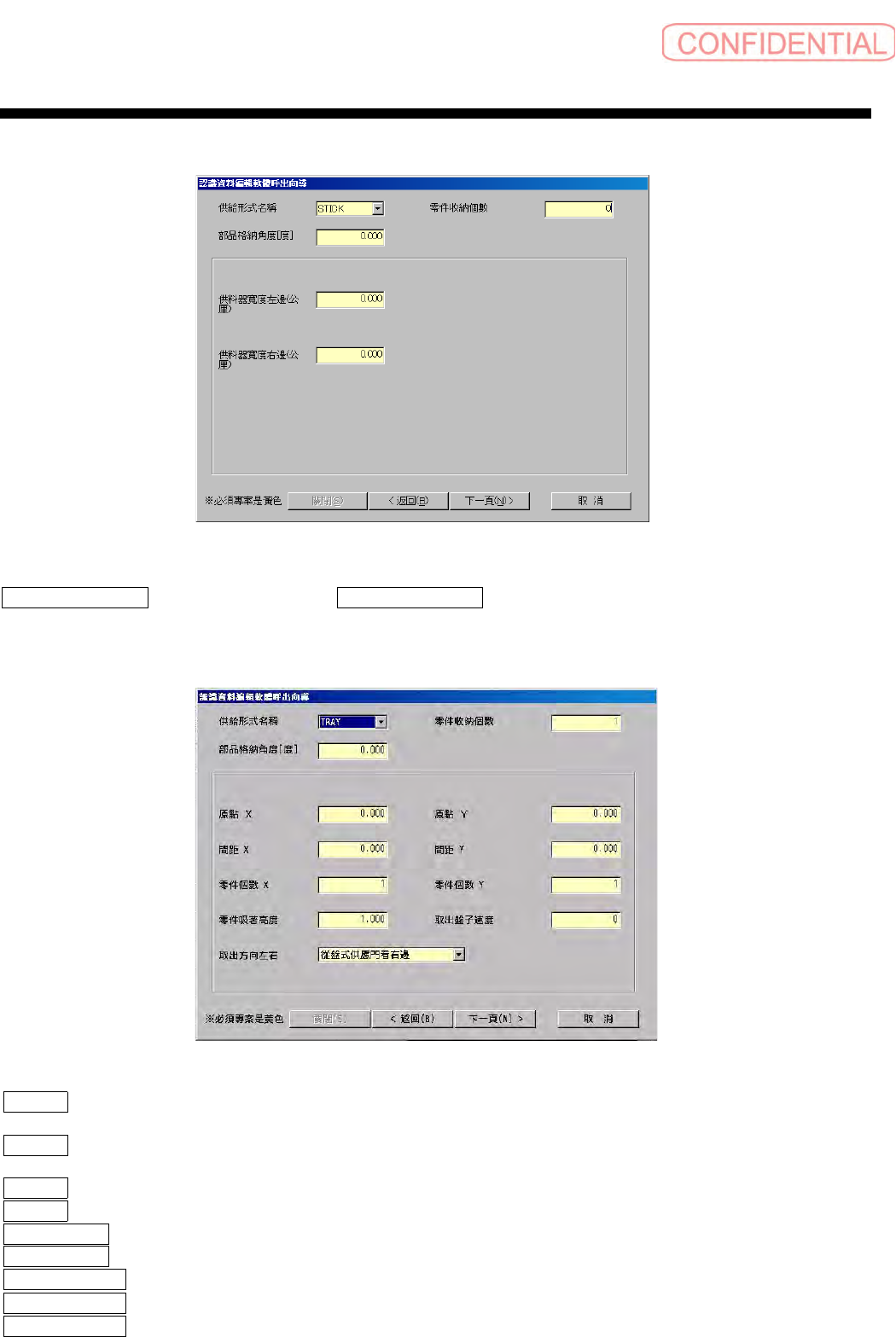 供料器寬度右邊 ( 供料器宽度右边 ) 、 供料器寬度左邊 ( 供料器宽度左边 ) :管装供料器的宽度的右