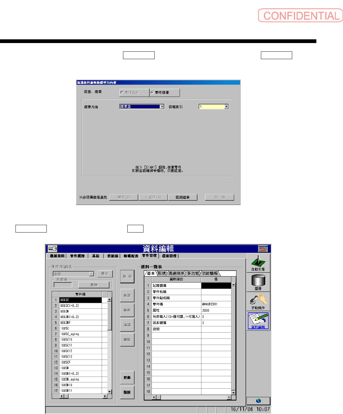 为了将认识的零件从吸嘴上取下,执行 零件廢棄 ( 零件废弃 ) ,取下零件后,点击 認識結束 ( 认识