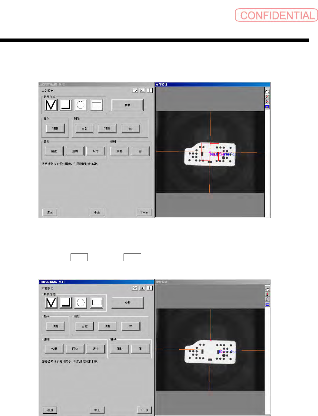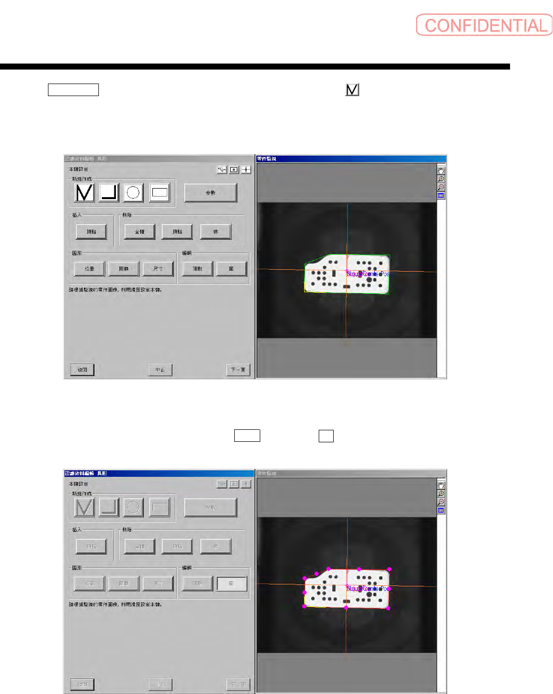 零件认识数据制作篇 2 . 顺序 电子零件装着机 SI-G20 0Mk3 (CS) 2-57 会出现异形本体设定画面。 首先,不要用缺省显示的长方形的 数据,点击零件监视器上的 长方形线,选择 ( 红线 ) 。 图 2.1.7-7 缺省图的删除 在被选择的状态下,用 刪除 ( 删除 ) - 全體 ( 全体 ) ,删除线。 图 2.1.7-8 缺省图的删除
