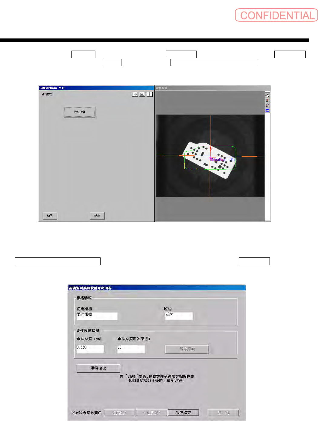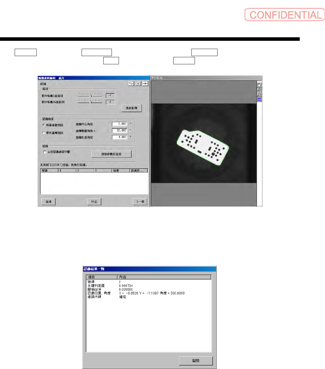 零件认识数据制作篇 2 . 顺序 2-60 电子零件装着机 SI-G200Mk3 (CS) 点击 下一頁 ( 下一页 ) 。向 認識開始 ( 认识开始 ) 画面移动,按 ST AR T 钮,执行识别。 识别被执行,如果识别结果处 显示 確定 ( 确定 ) 后,请按 STOP 钮,停止认识处理。 图 2.1.7-1 3 認識 ( 认识 ) 设定 画面 若点击结果的行列,则显示其 详细内容。 图 2.1.7-1 4 認識結果一覽 ( 认识结…