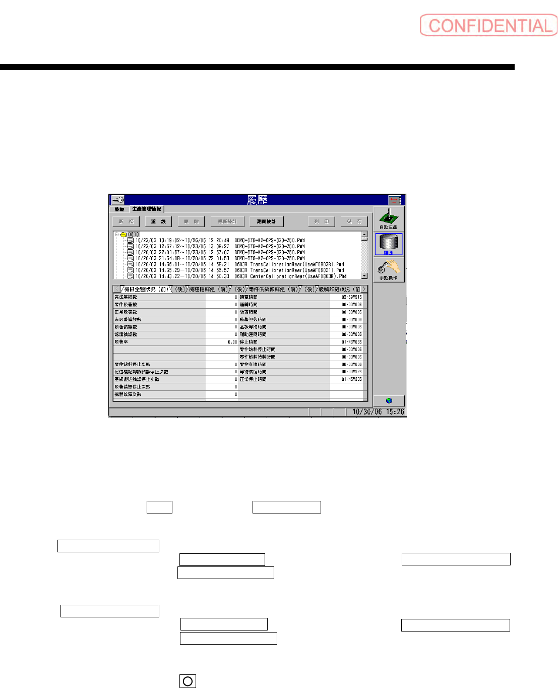 1. 自动生产停止后,点击 履歷 ( 日志 ) 画面→ 生產管理情報 ( 生产管理信息 ) 标签。出现以下画