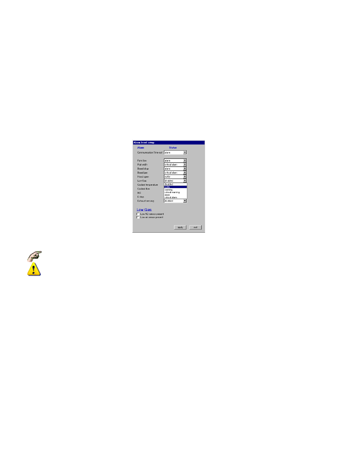 TO MODIFY AN ALARM LEVEL Modifying the Alarm Level is done by selecting Setup, Alarms , which displays the Alarm Level Setup Dialogue Box: z Click on a drop-down list to display the Level Options. z Select the desired Le…