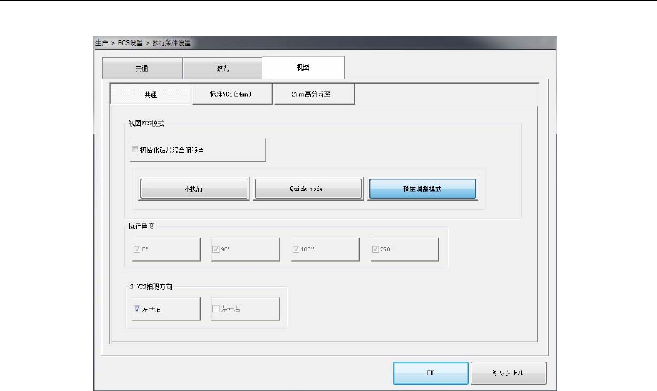FCS 使用说明书 2-1-3-3 视图 实施视图 FCS 的执行条件 的设定。 页面的构成分为 3 部分,分别为 [ 共通 ] 、 [ 标准 VCS] 、 [ 选项 VCS] 页面。 图 2-6 FCS 设定(视图)画面 (1) 视图 FC S 模式 在 [ 将贴片综合偏移量初始化 ] 为勾选状 态时,清除视图相关的贴片综合偏移 量。 选择 [ 不执行 ] ,则不执行视图的 FC S 生产。 选择 [Quick mode] ,则 可以…