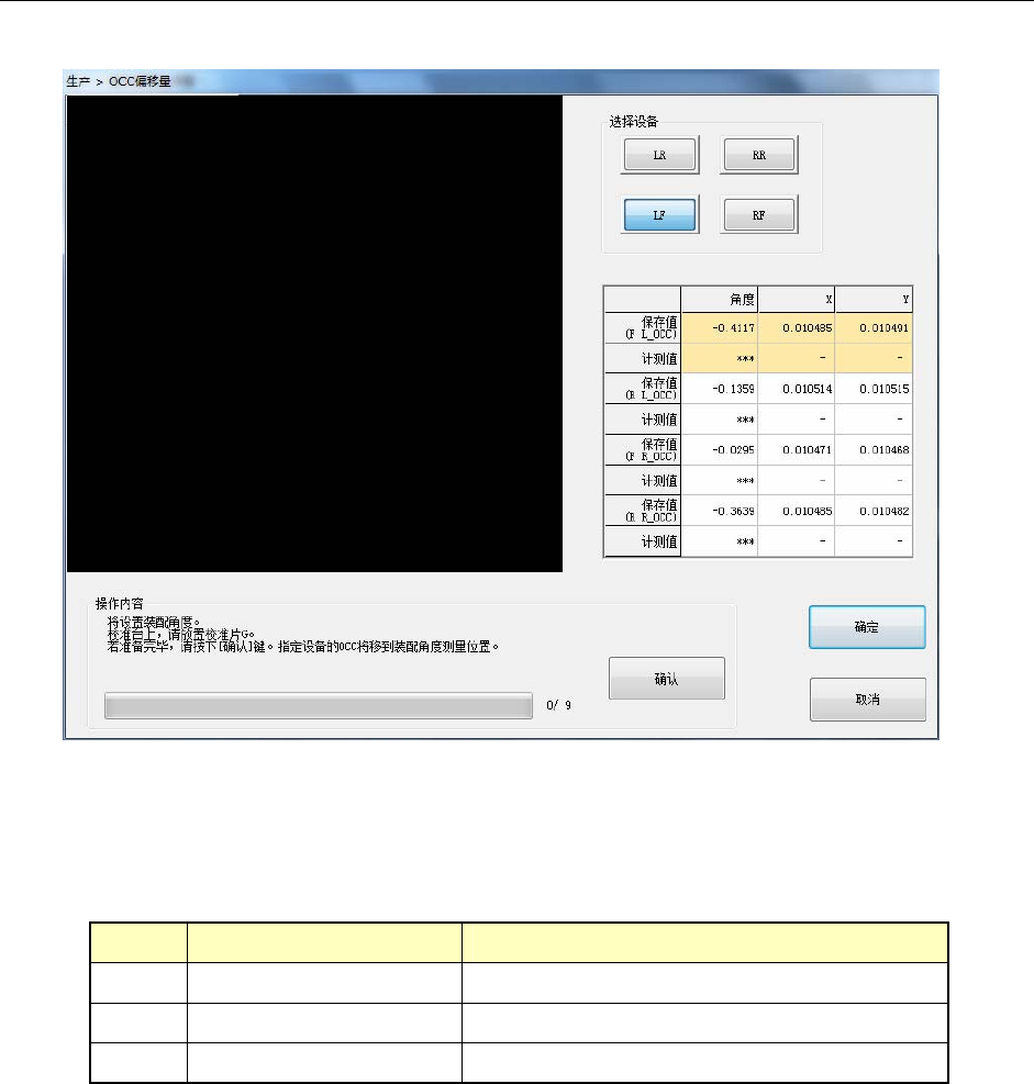 FCS 使用说明书 ● 操作方法 图 3-8 操作画面指示( 0/9 ) 请将 GAL 片 G 模具放到校准台上。 这时, 要把 GAL 片 G 模具的标记与校准台的第 1 标记对好。 GAL 片 G 模具有正反面, 可读到 F 标记的一 面是表面。 校准片 G 模具 校准模块(LF,LR) 校准模块(RF,RR) F 标记 第 1 标记 第 1 标记 标记 图 3-9 校准片 G 模具的设置位置 按下 [ 确认 ] 按钮,则 OCC …
