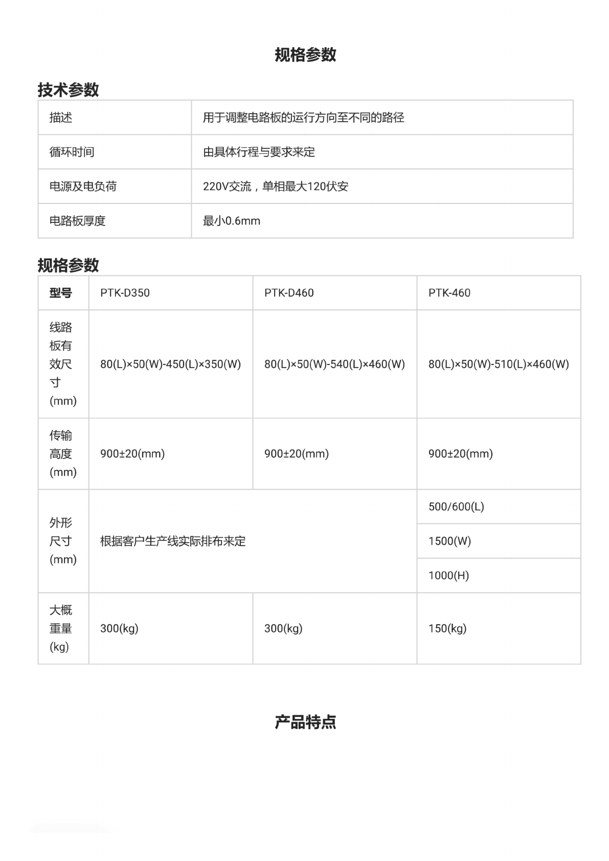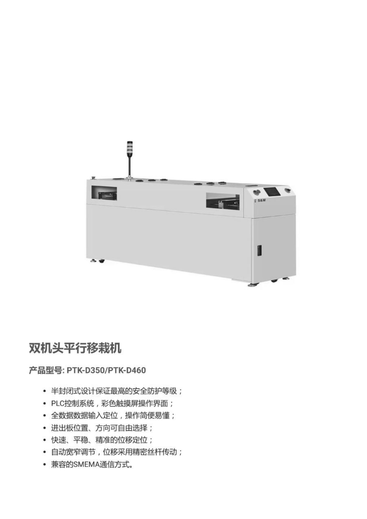 双机 头平行 移栽机 产品 型号: PTK-D350/PTK-D460 • 半封 闭式设 计保证 最高的 安全防 护等级 ; • PLC 控 制系统 , 彩色触 摸屏操 作界面 ; • 全数据 数据输 入定位 , 操作简 便易懂 ; • 进出板 位置、 方向 可自由 选择; 快 速、 平稳、 精 准的位 移定位 ; • 自动宽 窄调节 ,位移 采用精 密丝杆 传动; • 兼容的 SMEMA 通信 方式。