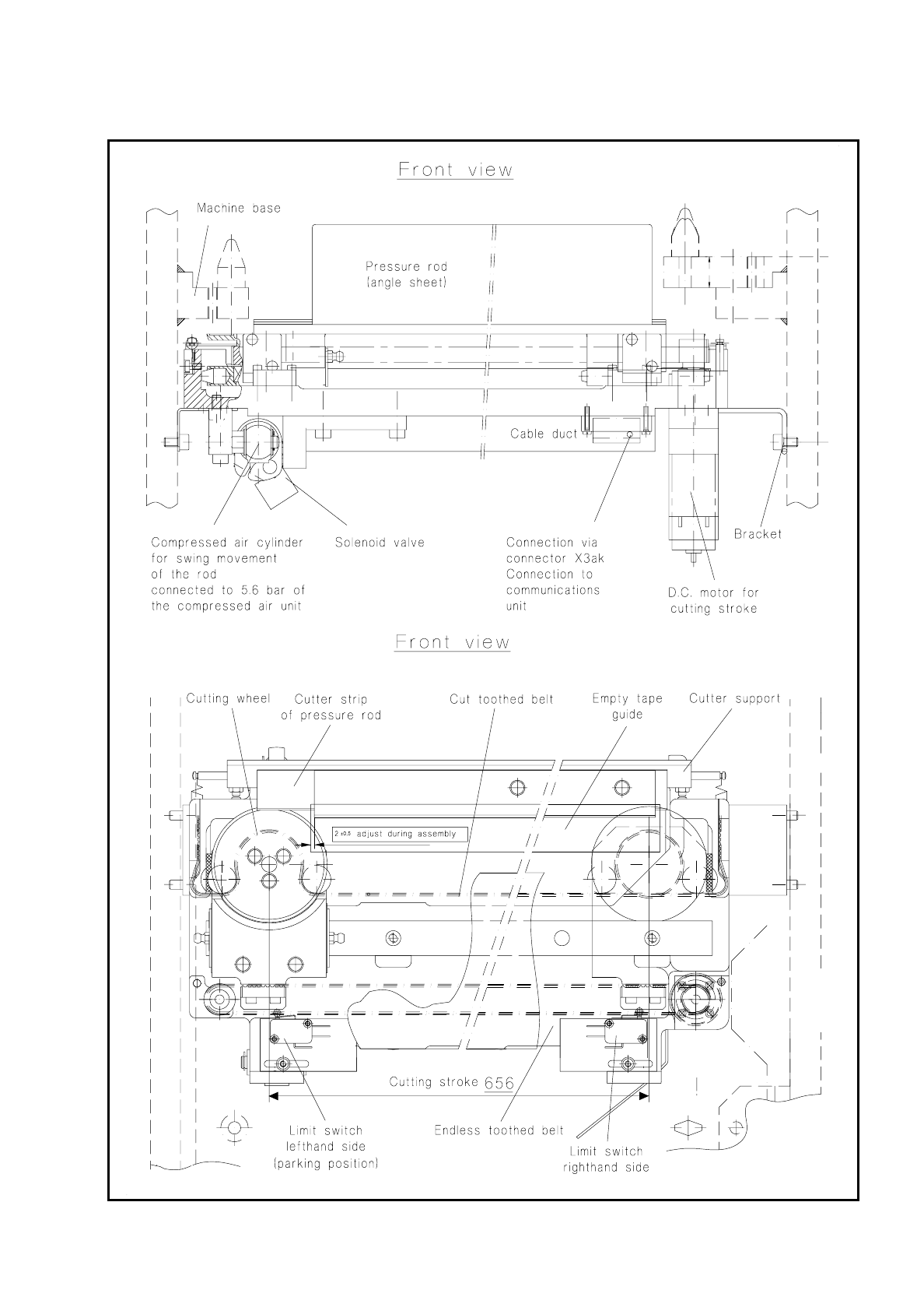 Fig. 7.1.4 Empty tape cutting unit: mounting in the machine base, structure and connections