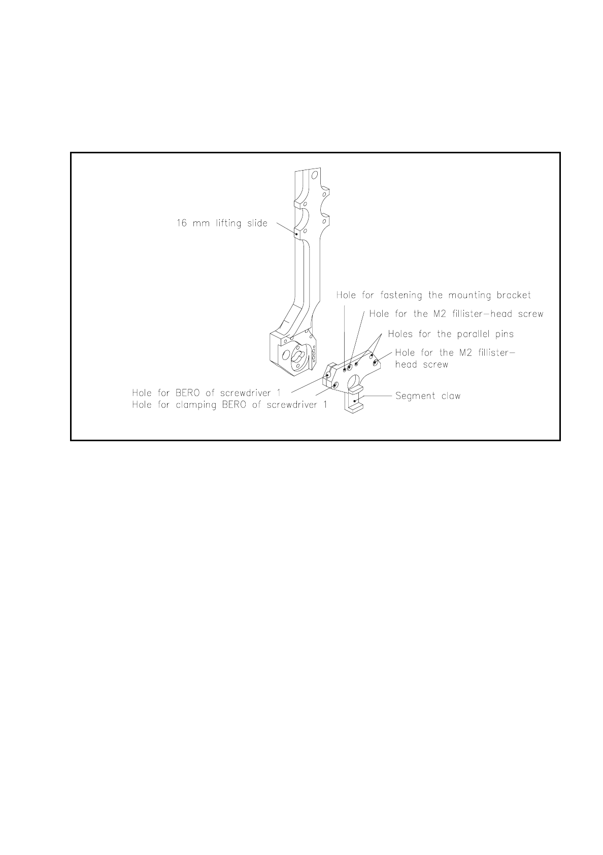 The segment claw is fastened by two M2 fillister head screws to the bottom end of the 16 mm lifting slide. Two