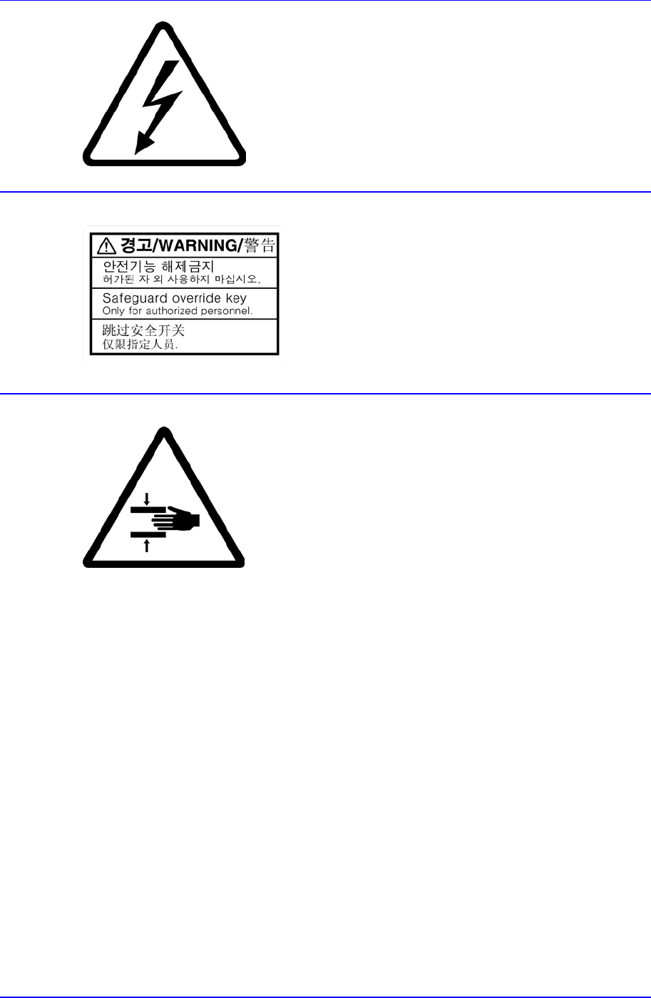 Advanced High Speed Flexible Mounter 6 盖子内侧及周围 连接物部位 存在高电压 要注意电击危险。 在维护和修理设 备操作时一 定要先切断 主电源。 请不要移掉安全装置,否则可能导致严 重的伤亡事故。 运行中禁止手触摸 贴有此标签的位置设置有移动体,在运 行时如果分解移动体或将盖子打开,身 体某部分伸入到设备 内部是非常危险 的 。 服务前中止设备运行 在维护和修理设 备或在纠正 出错操作前 要先中止…