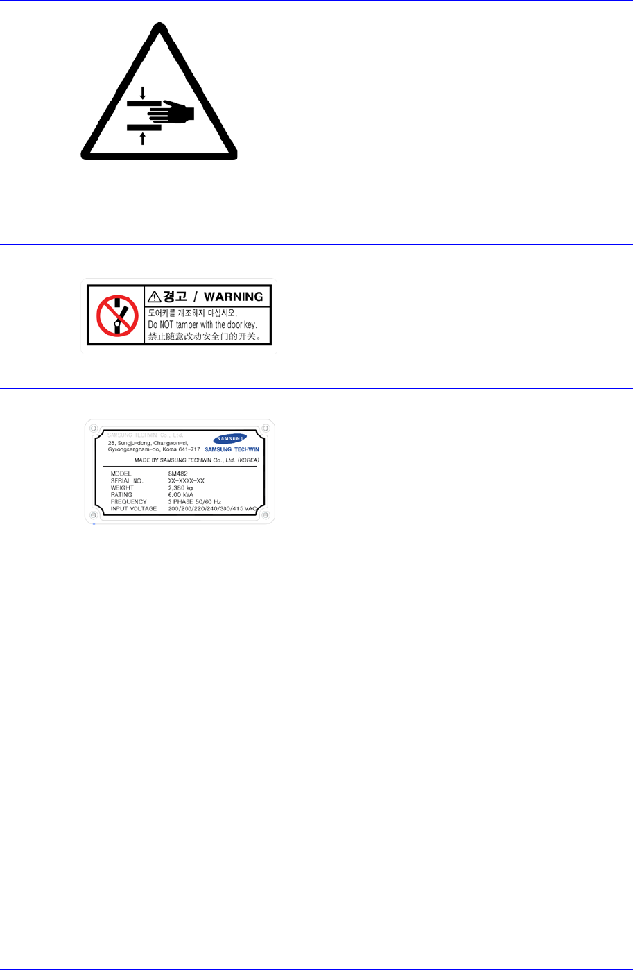Advanced High Speed Flexible Mounter 8 运行中禁止手触摸 贴有此标签的位置设置有移动体,在运 行时如果分解移动体或将盖子打开,身 体某部分伸入到设备内部是非常危险 的 。 服务前中止设备运行 在维护和修理设 备或在纠正 出错操作前 要先中止设备运行。 设备铭牌 (M achine Name Plate) 明示着设备的型 号名、序列 号及设备基 本规格。 确认铭牌上显示 的气压与电 压规格后, 运行设…