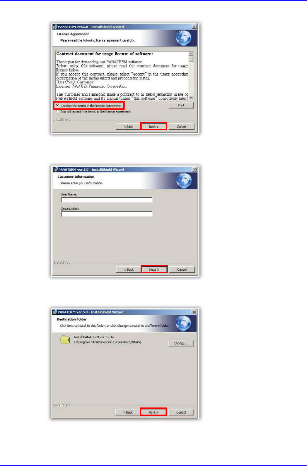 电动机 驱动 器 15 7. 如下所示地选择“ ac cept ”后选择 “ Next ”键。 8. 不要在 Custom er Information 窗口填写内 容,选择“ Next ”键。 9. 在下列照片选择“ Next ”键。